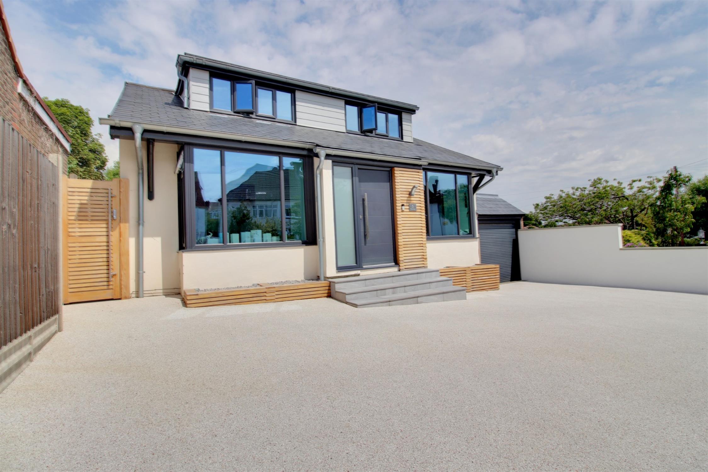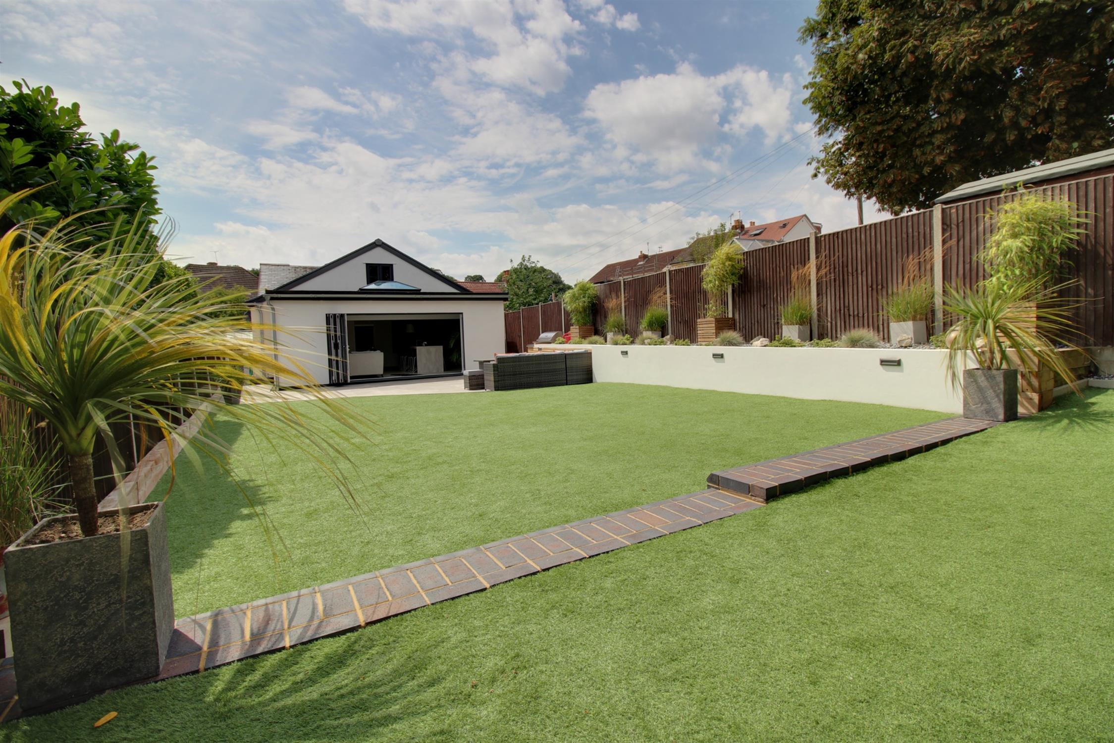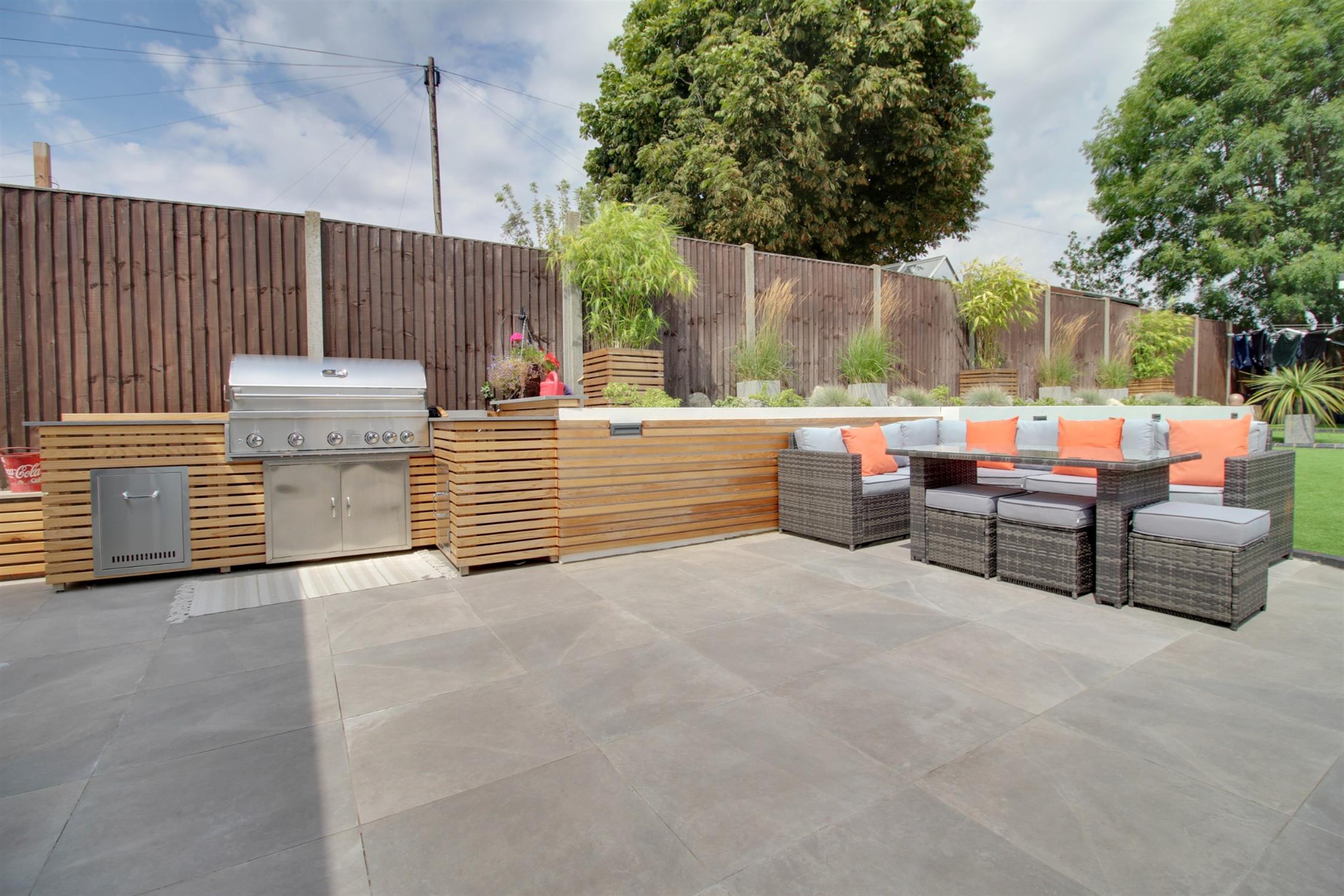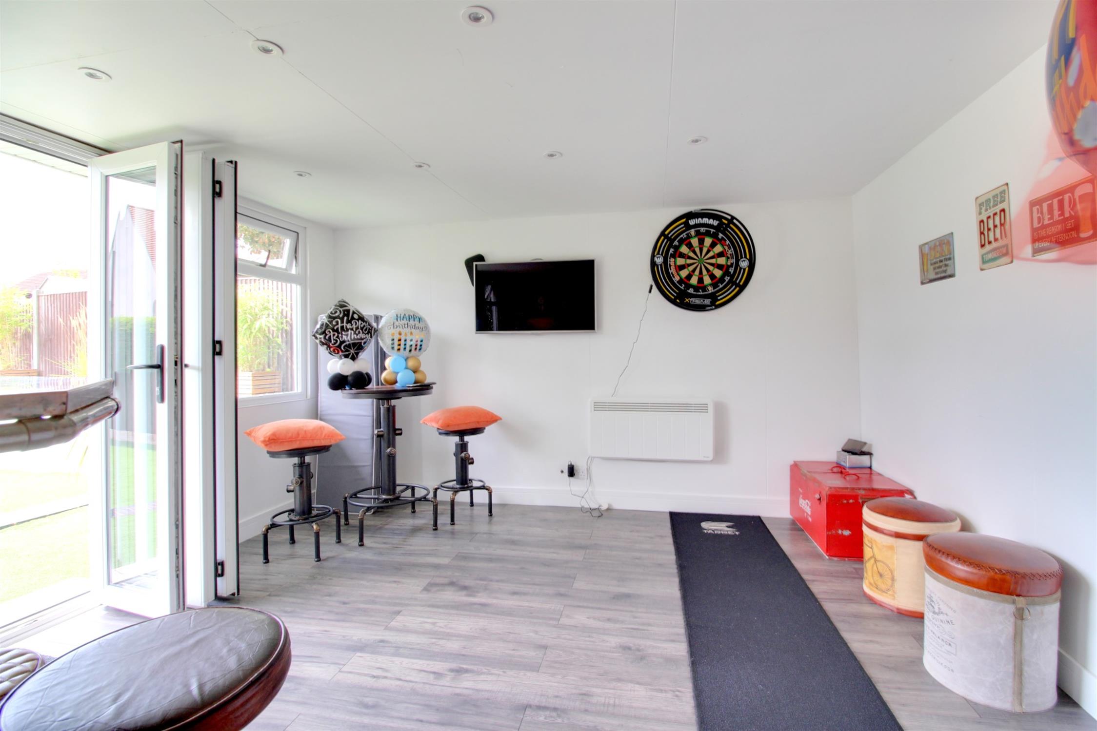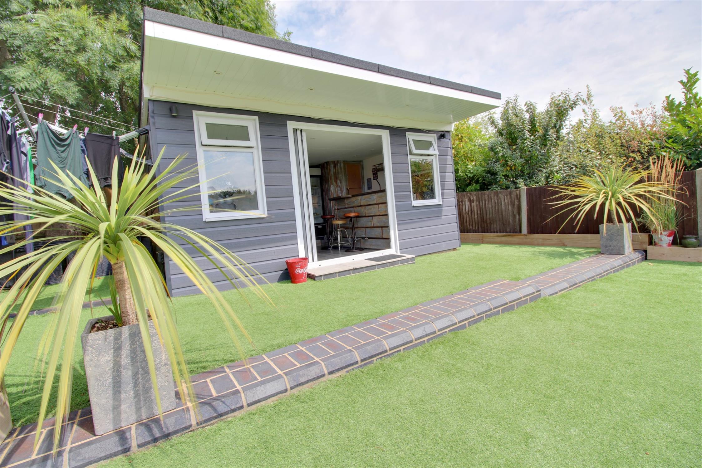 To the front of the property there is ample parking for multiple vehicles on a private resin driveway which leads to a garage with an electric roller door, light, power, and personal doors. Side pedestrian access leads to the landscaped garden which boasts patio area with built in barbecue station, established raised border and Astro turf. There is also an outbuilding which is currently being used as a bar but could easily be utilised as a home office or salon as the space benefits bi-folding doors and double glazed window, light, power, electric heater, water supply and an enclosed WC with wash hand basin.