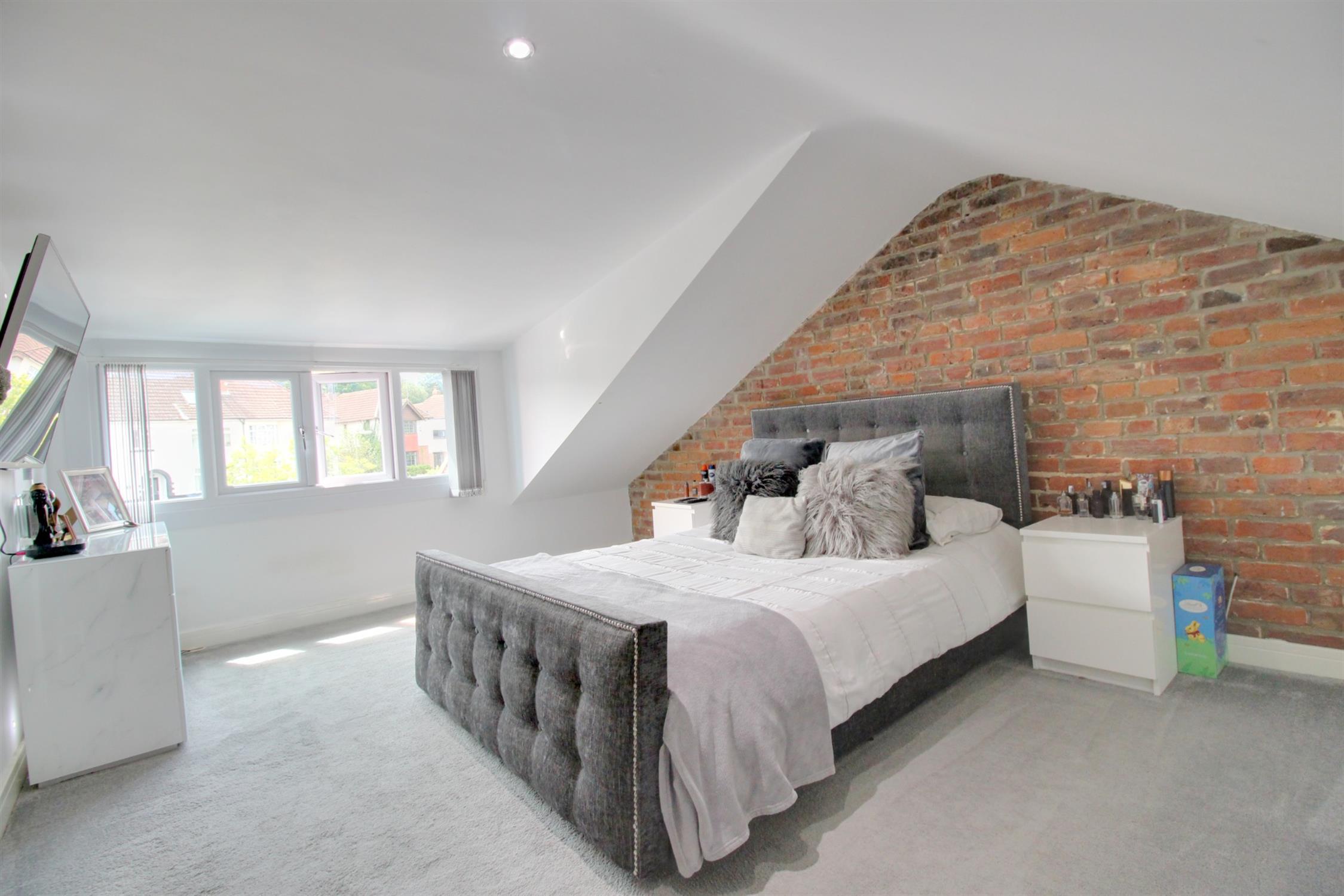 Double glazed window to the front, carpeted flooring, radiator and exposed brick feature wall.