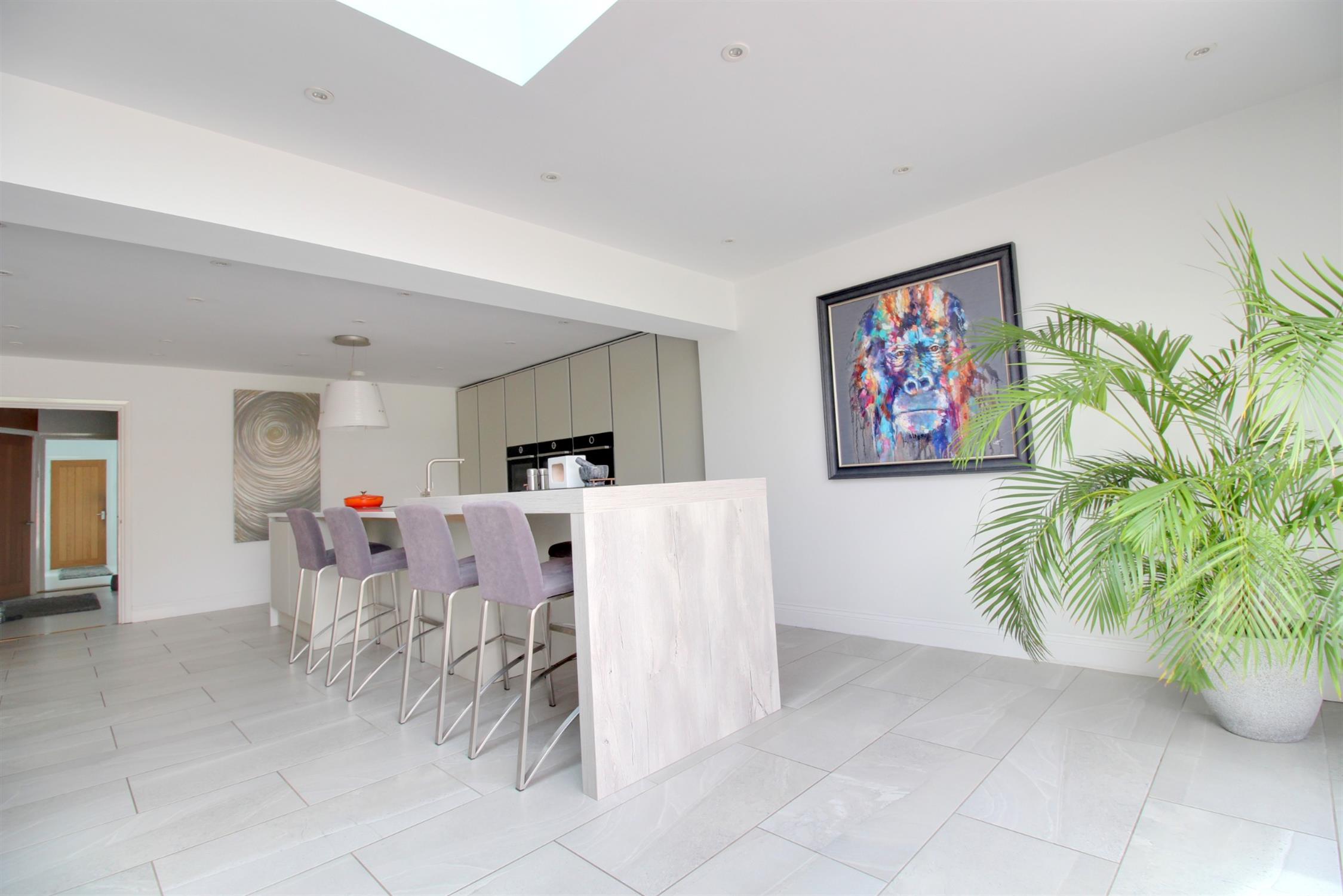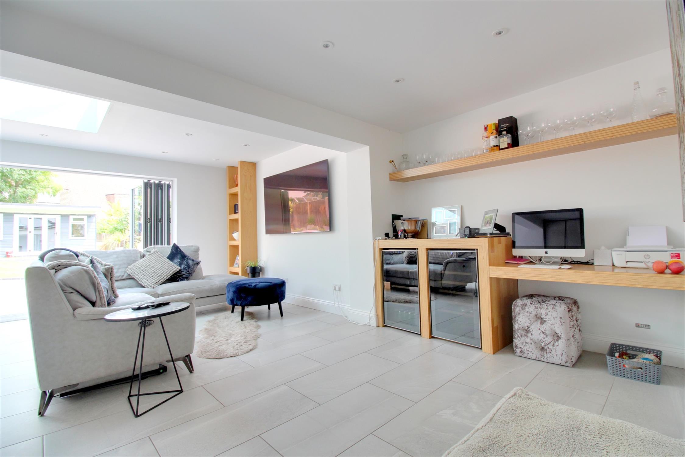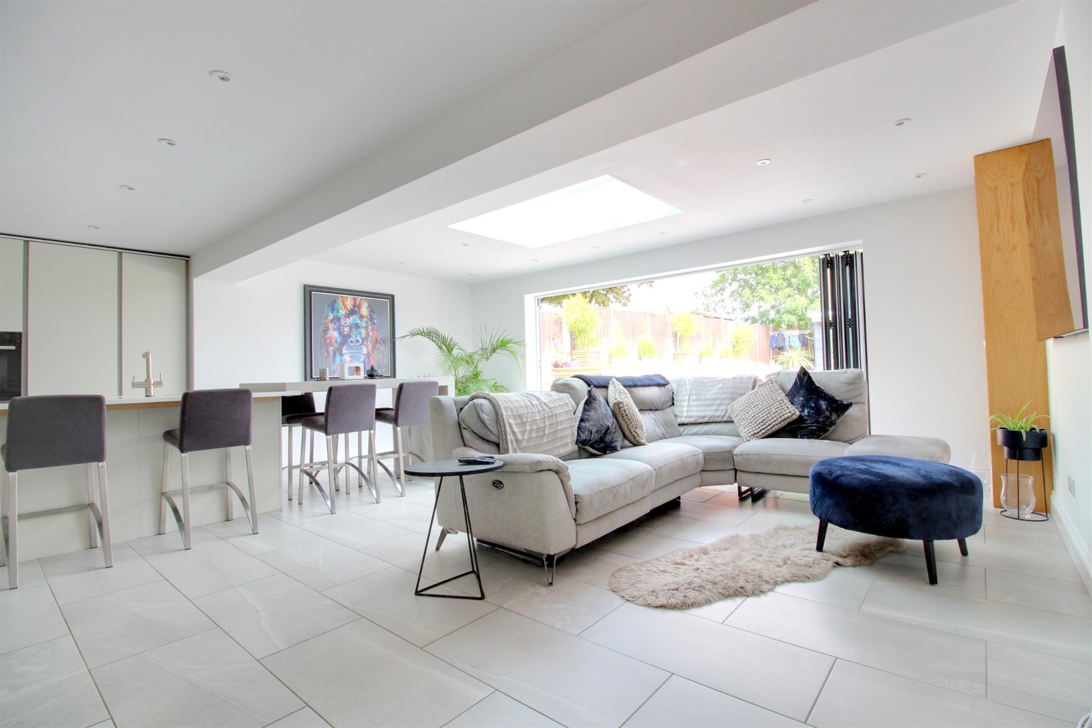 Tiled flooring with underfloor heating, double glazed Aluminium bi-folding doors leading to the rear garden, sky lantern, fitted with a range of soft closing wall cupboards and base units to match including Island built in tall fridge and separate freezer, two ovens, hot plate and microwave, induction hob and extractor fan above, single sink with mixer and boiling tap, Quartz Granite worktop, breakfast table, ample space for living and dining furniture, space and plumbing for two drinks fridges and built in study area.