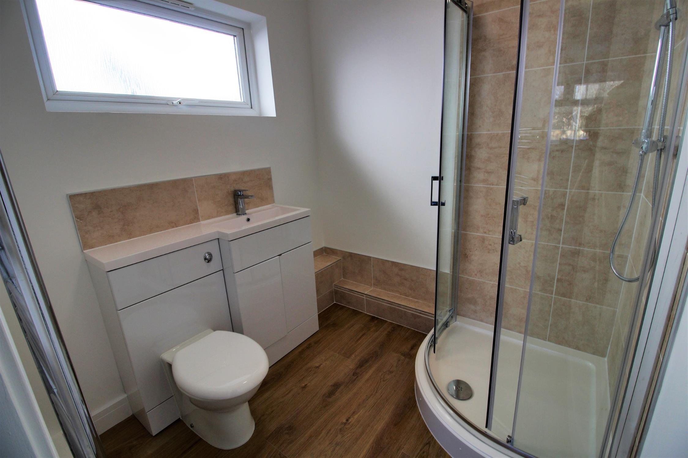 Opaque double glazed window to side, tiled corner shower cubicle, dual flush w.c., hand basin with mixer tap set above vanity storage unit, ladder style towel radiator, ceiling extractor, vinyl laminate flooring.