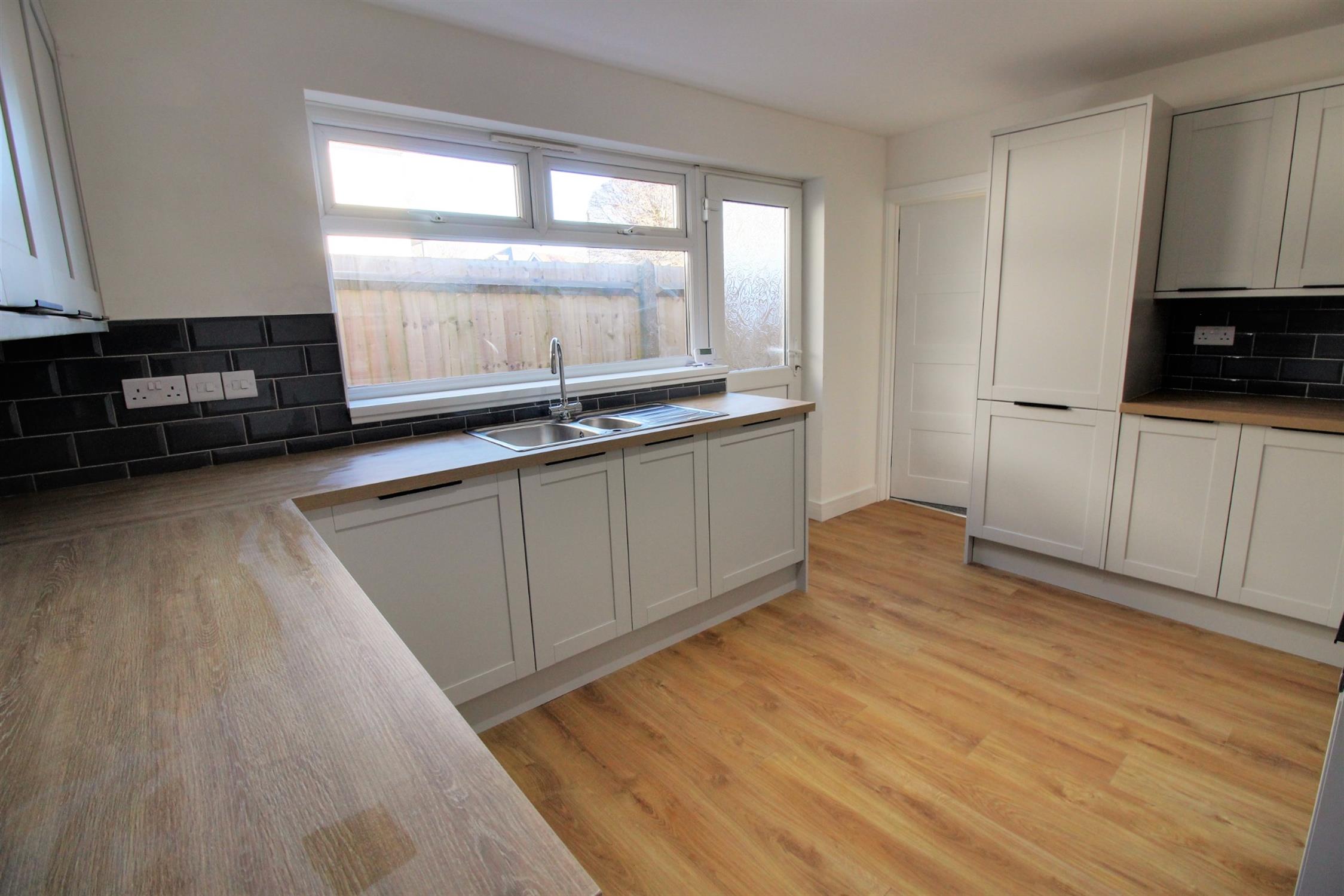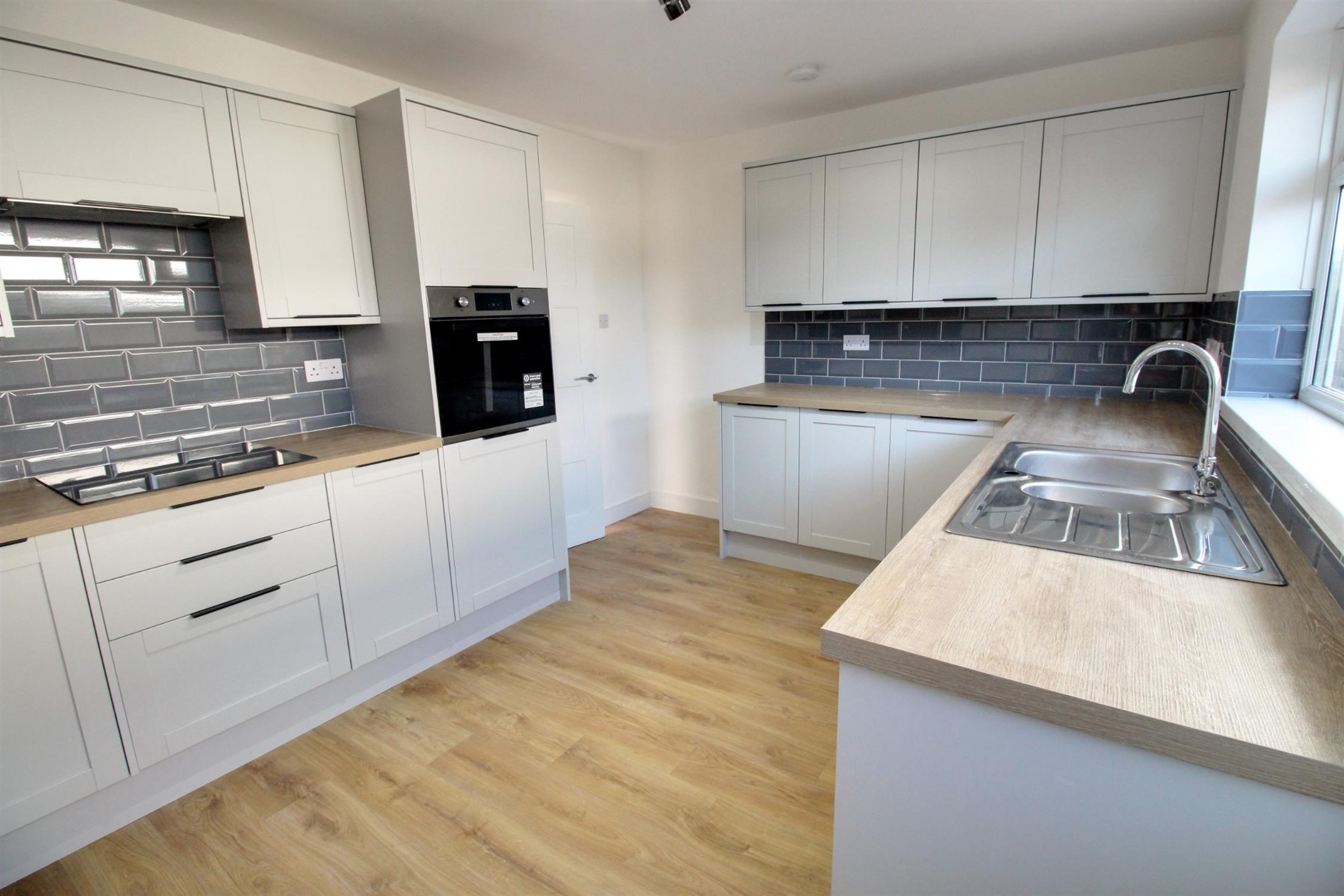 Double glazed window to side, modern fitted range of 'Shaker' style wall and base units with soft closing doors, worktop with inset one and a half bowl single drainer sink unit and mixer tap. Integrated appliances to include: dishwasher, washing machine and fridge/freezer. Electric ceramic hob with concealed extractor, electric fan assisted oven, ceramic tiled splashbacks, smooth skimmed and coved ceiling, return door to entrance hall.