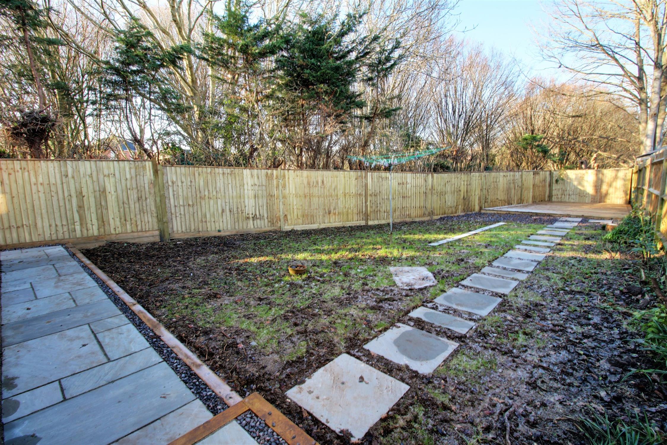 Closeboard fence enclosed with paved pathway, lawned area and timber decked area to the bottom end of the garden, external tap.