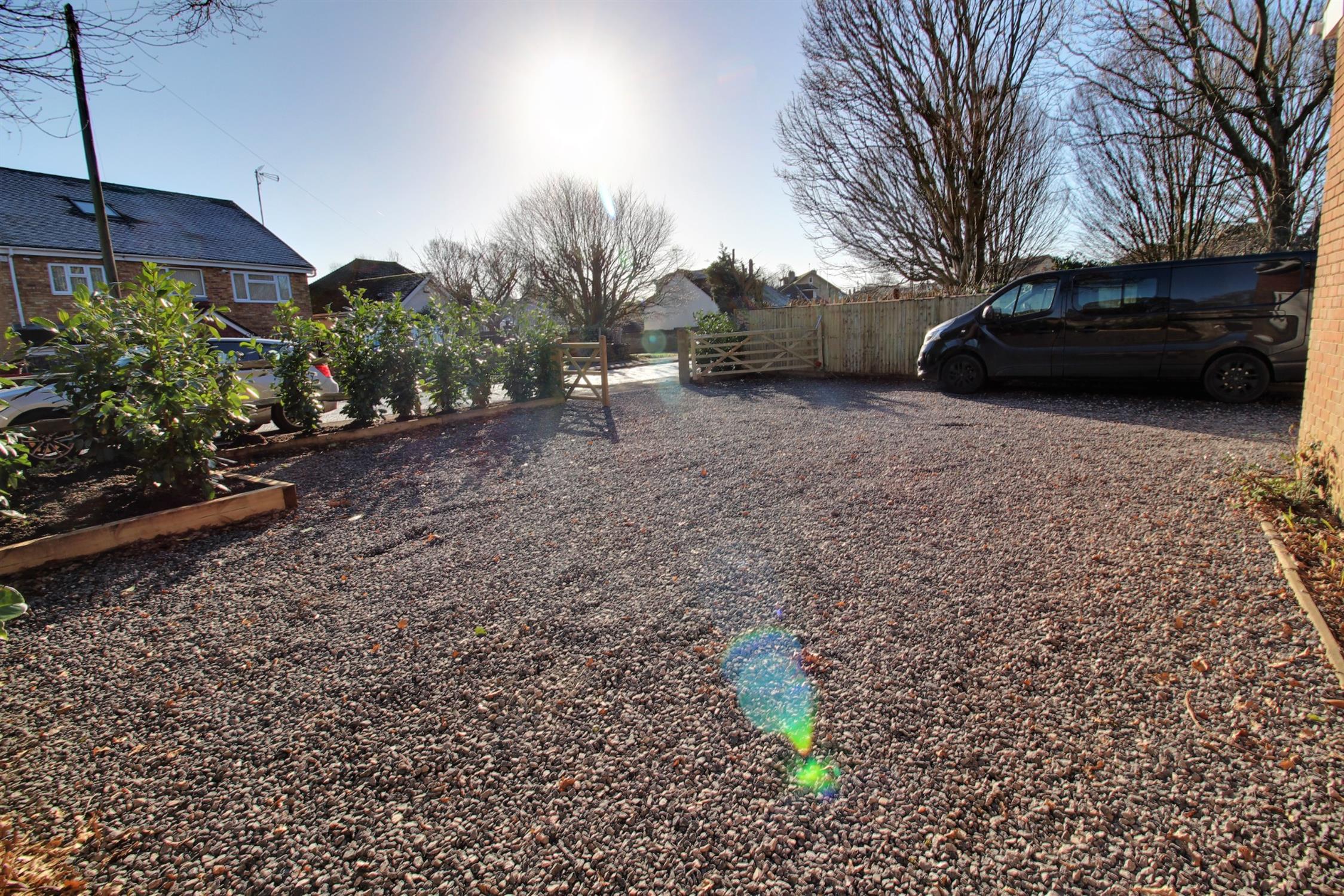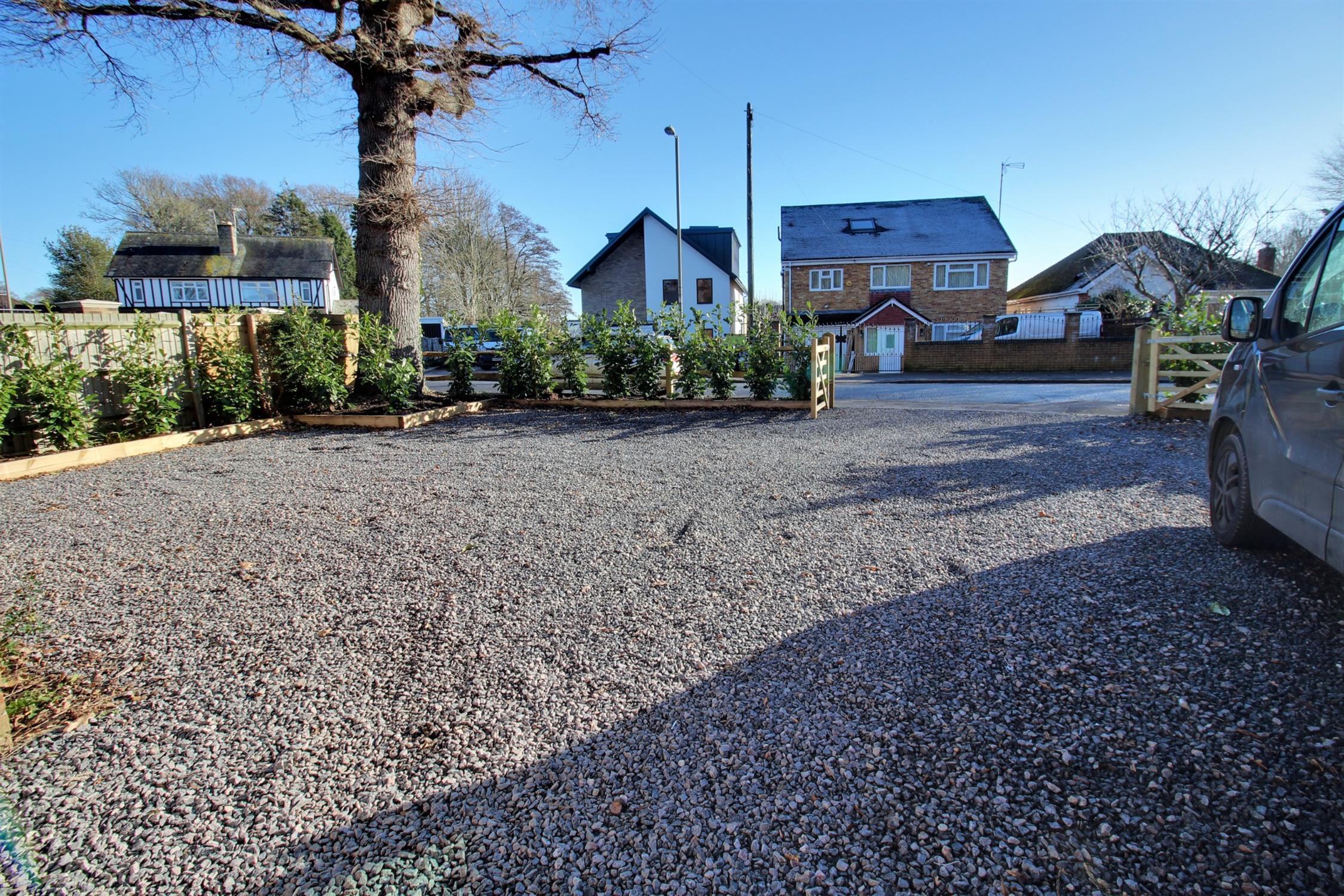 Timber post and rail fenced borders with laurel hedging, five bar gated entrance to large stone shingled driveway and parking area for six+ vehicles.Gated access to both sides providing access to side patio and rear garden.