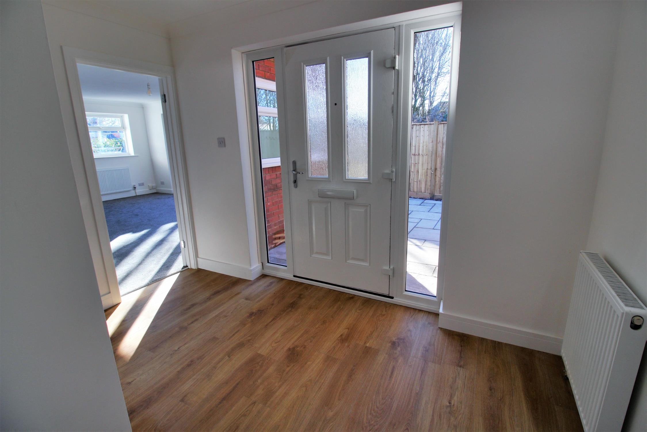 Opaque double glazed front door with two double glazed side panels, radiator, storage cupboard, access to insulated loft space, vinyl laminate flooring, smooth skimmed and coved ceiling.