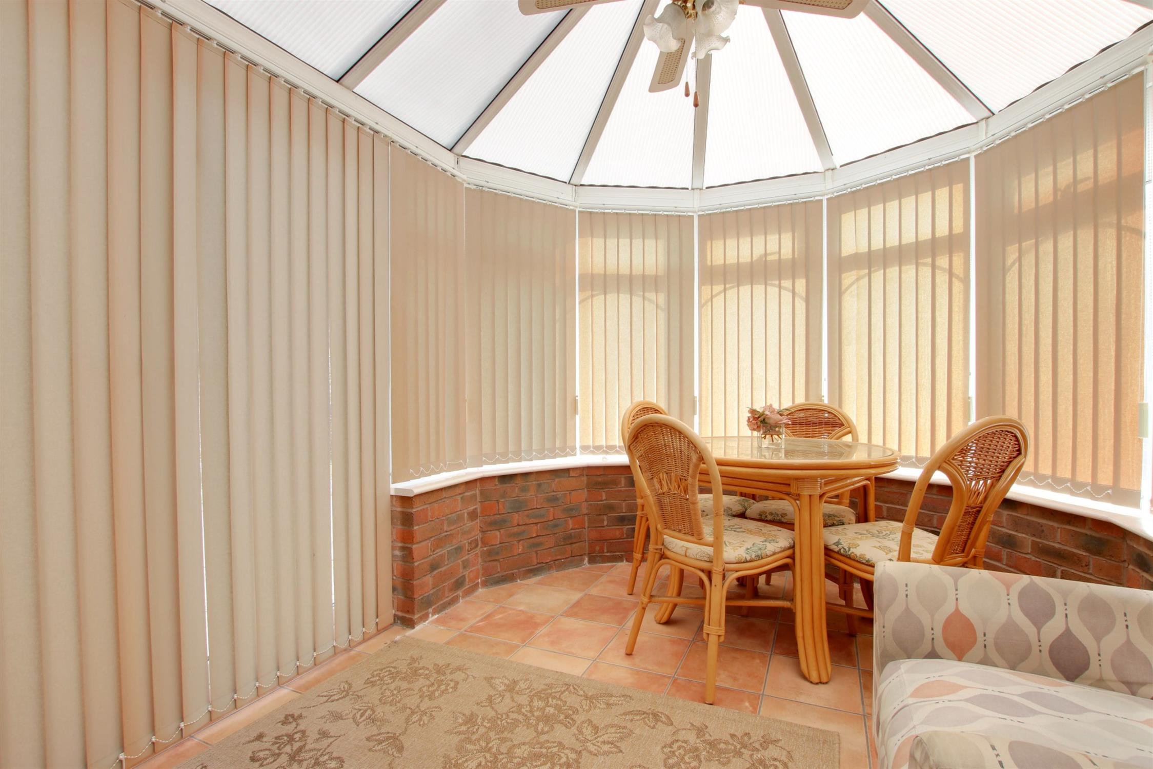 Double glazed conservatory built on a dwarf brick wall with double glazed French doors leading to garden. Tiled floor.