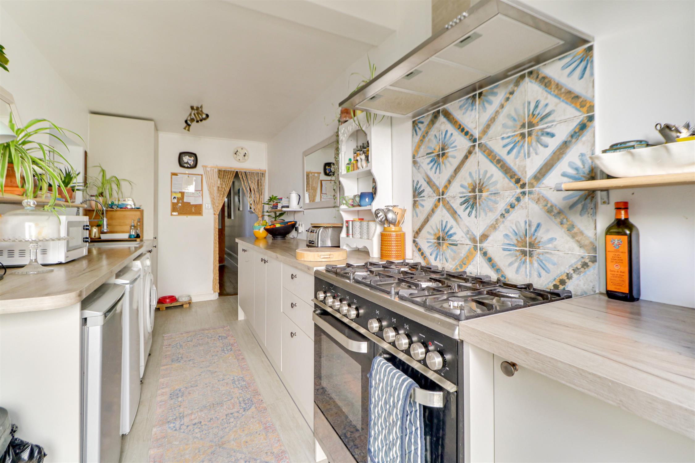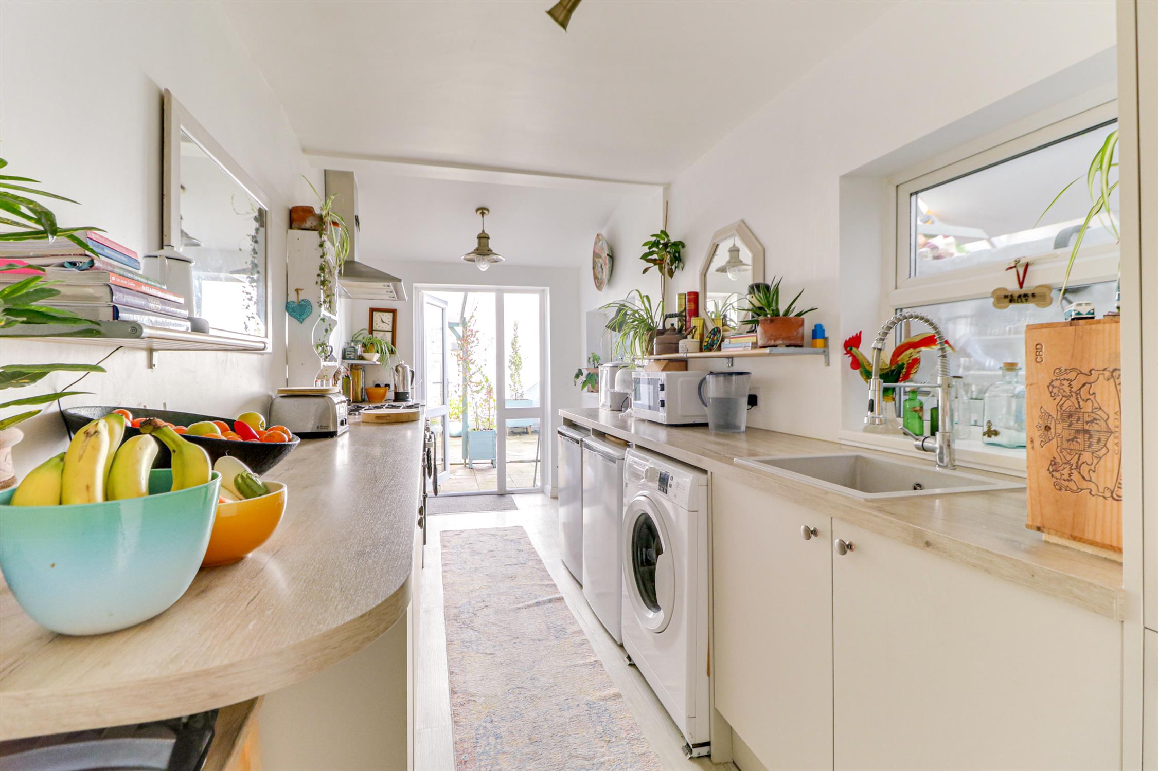 Smooth ceiling, two double glazed side aspect windows, double glazed door and side window to rear garden, range of wall and base mounted units with work surfaces over, inset sink unit with mixer tap over, Kenwood range-style cooker, extractor hood over, space for fridge, freezer and washing machine, radiator, part tiled walls, laminate flooring.