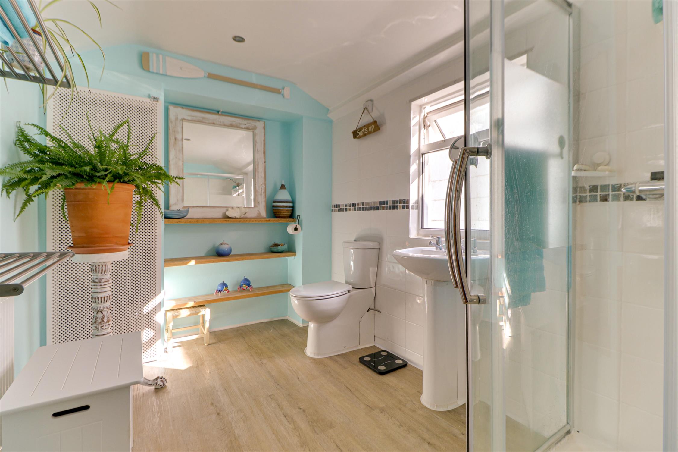 Smooth ceiling, inset spotlights, double glazed window, large curved shower cubicle, WC, pedestal wash hand basin, cupboard housing gas boiler, laminate flooring.