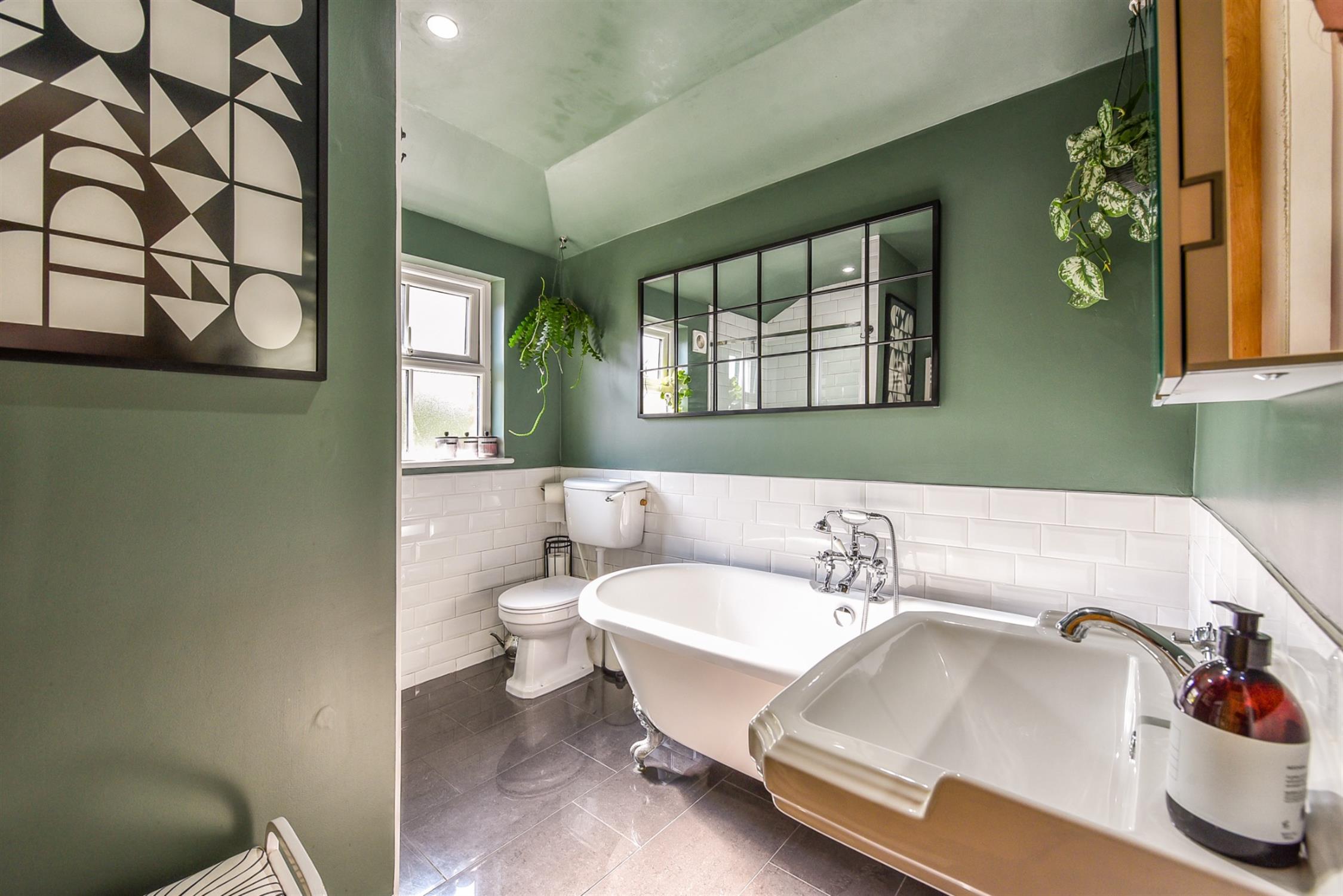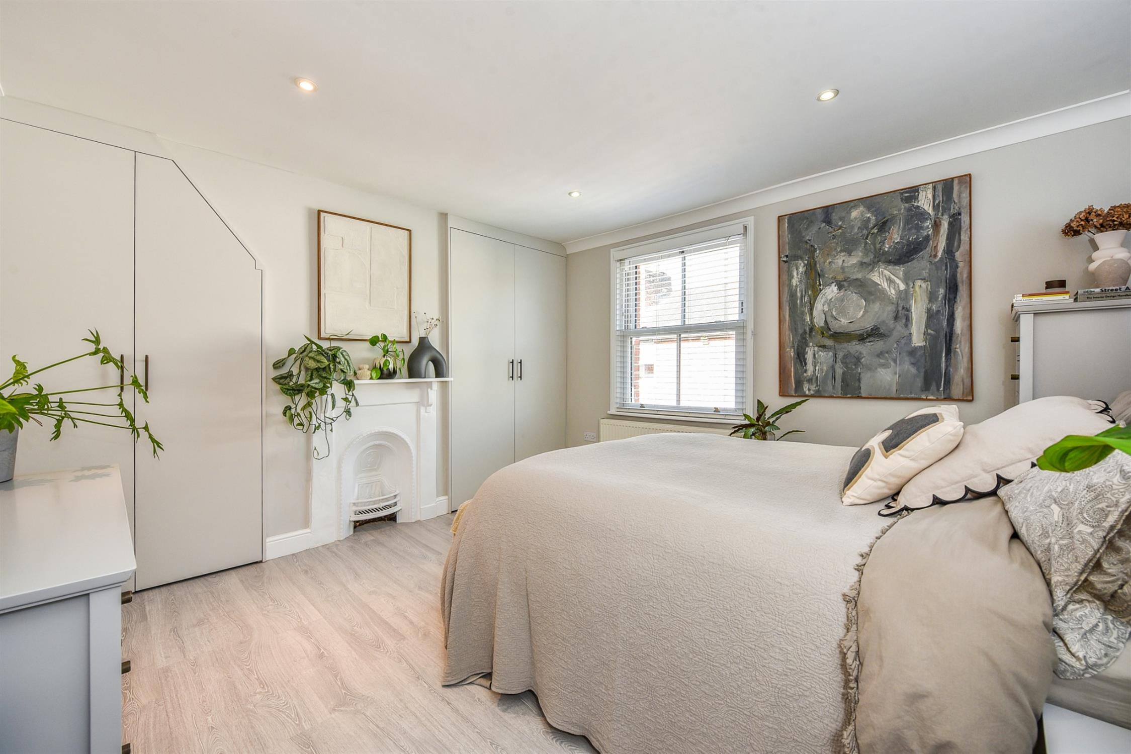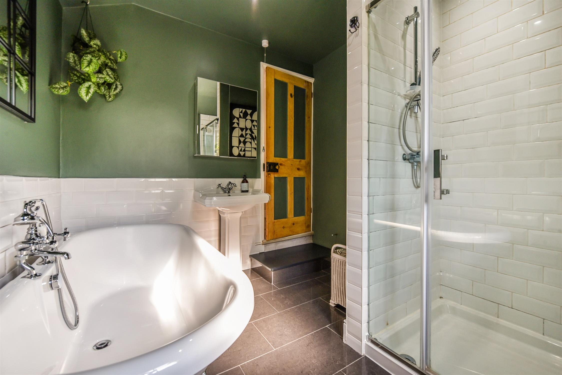Upstairs there is a bright bedroom with feature fireplace and bespoke fitted storage. The second bedroom is also a double with built in storage and attractive shelving unit. The bathroom has been fitted to a modern and contemporary style with white suite, including free standing bath and separate double shower.