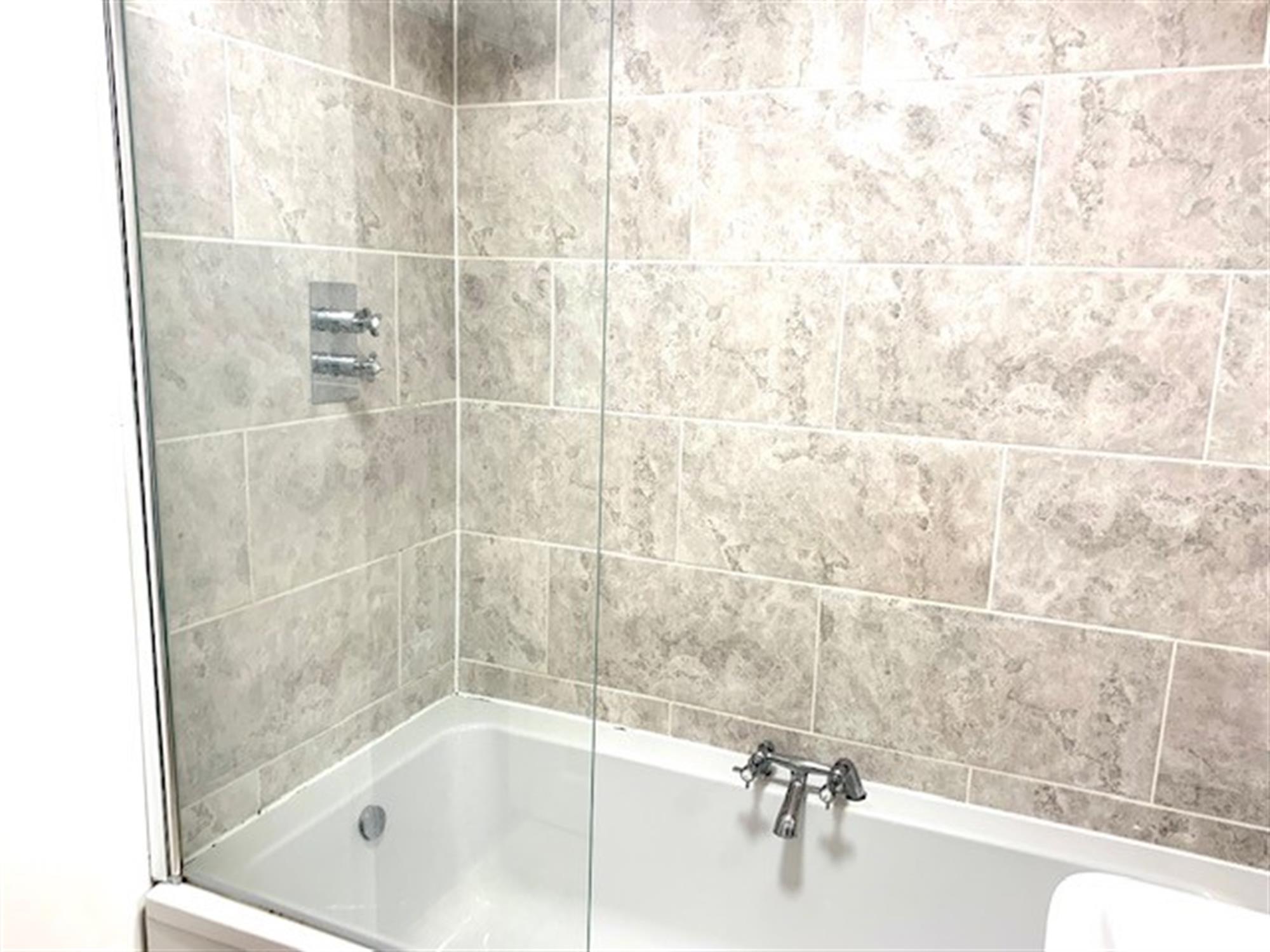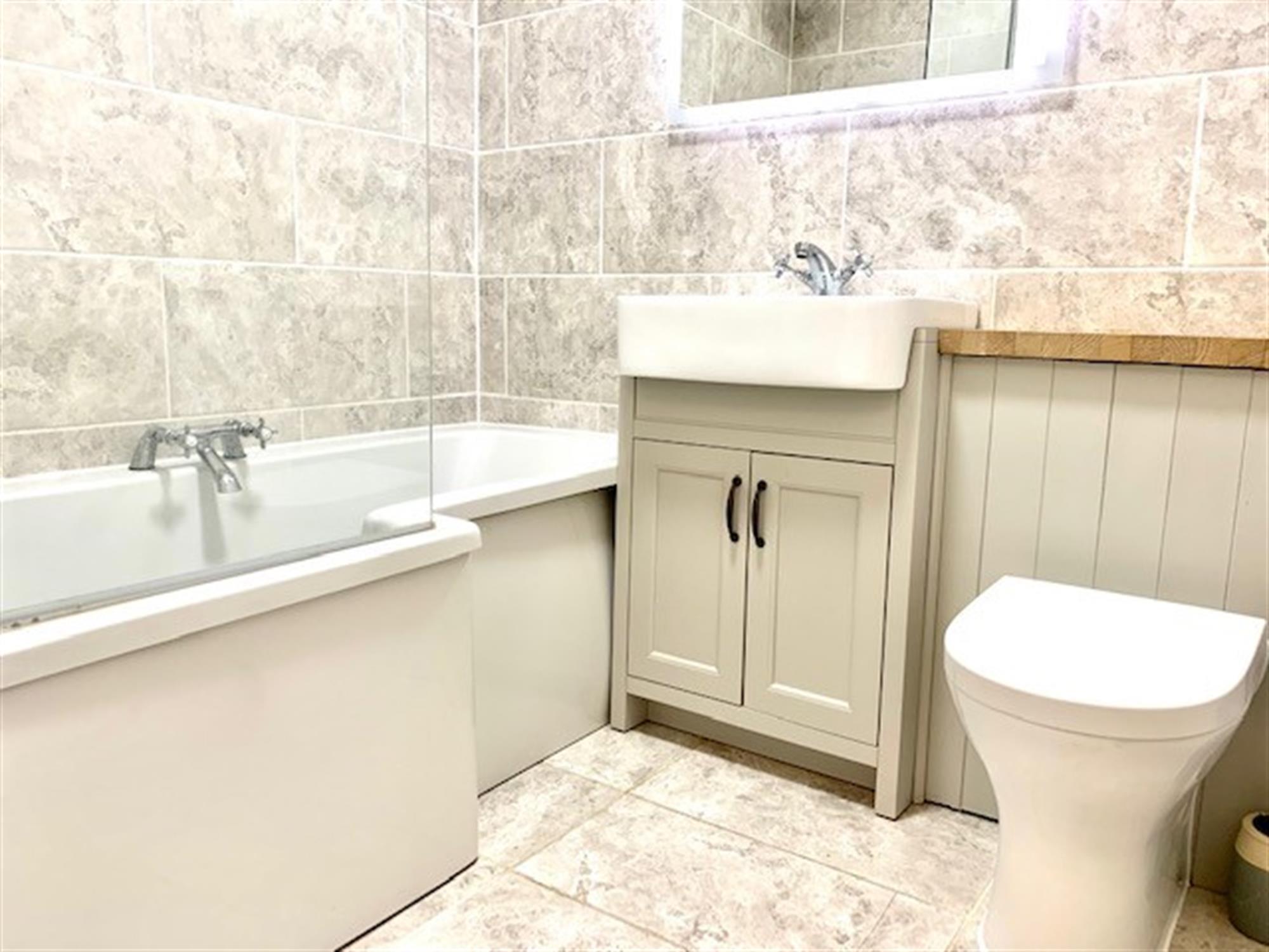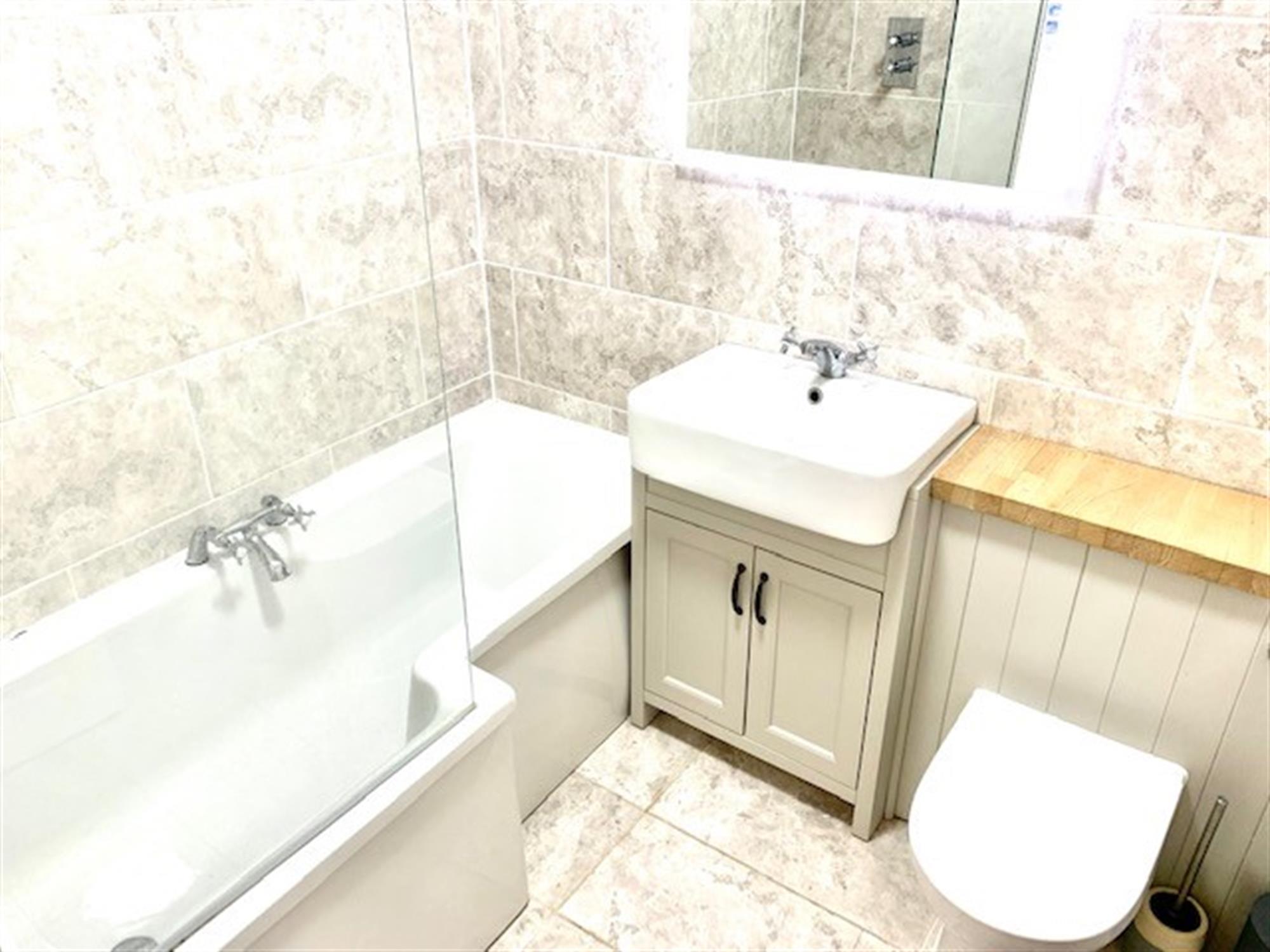 BATHROOM - Modern three-piece suite with shower over bath, basin inset in vanity unit and w.c.