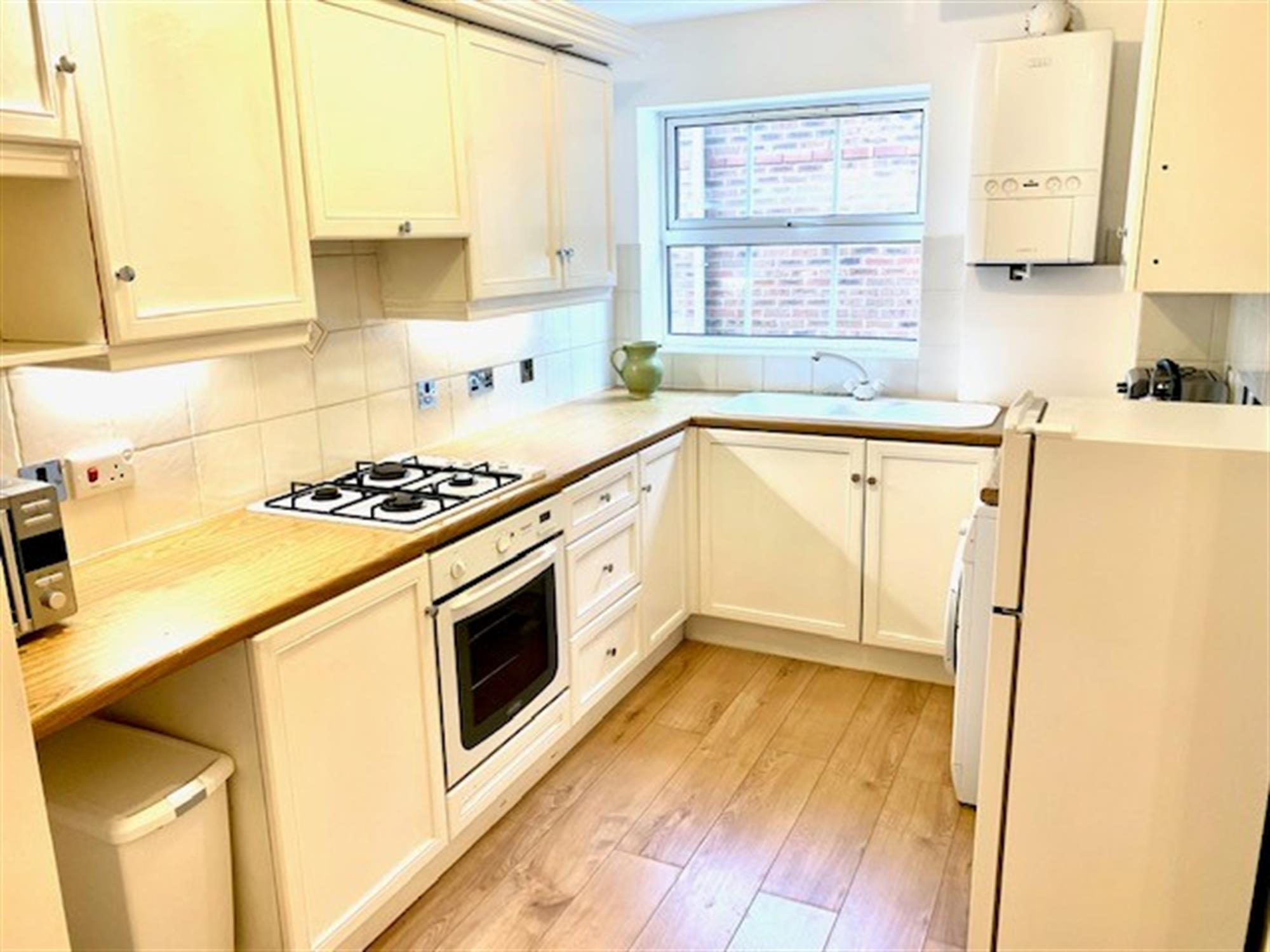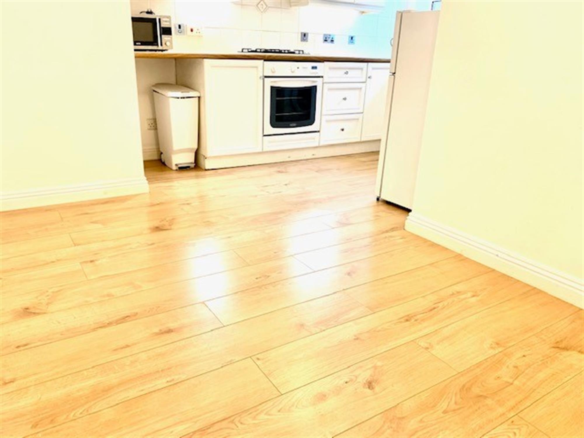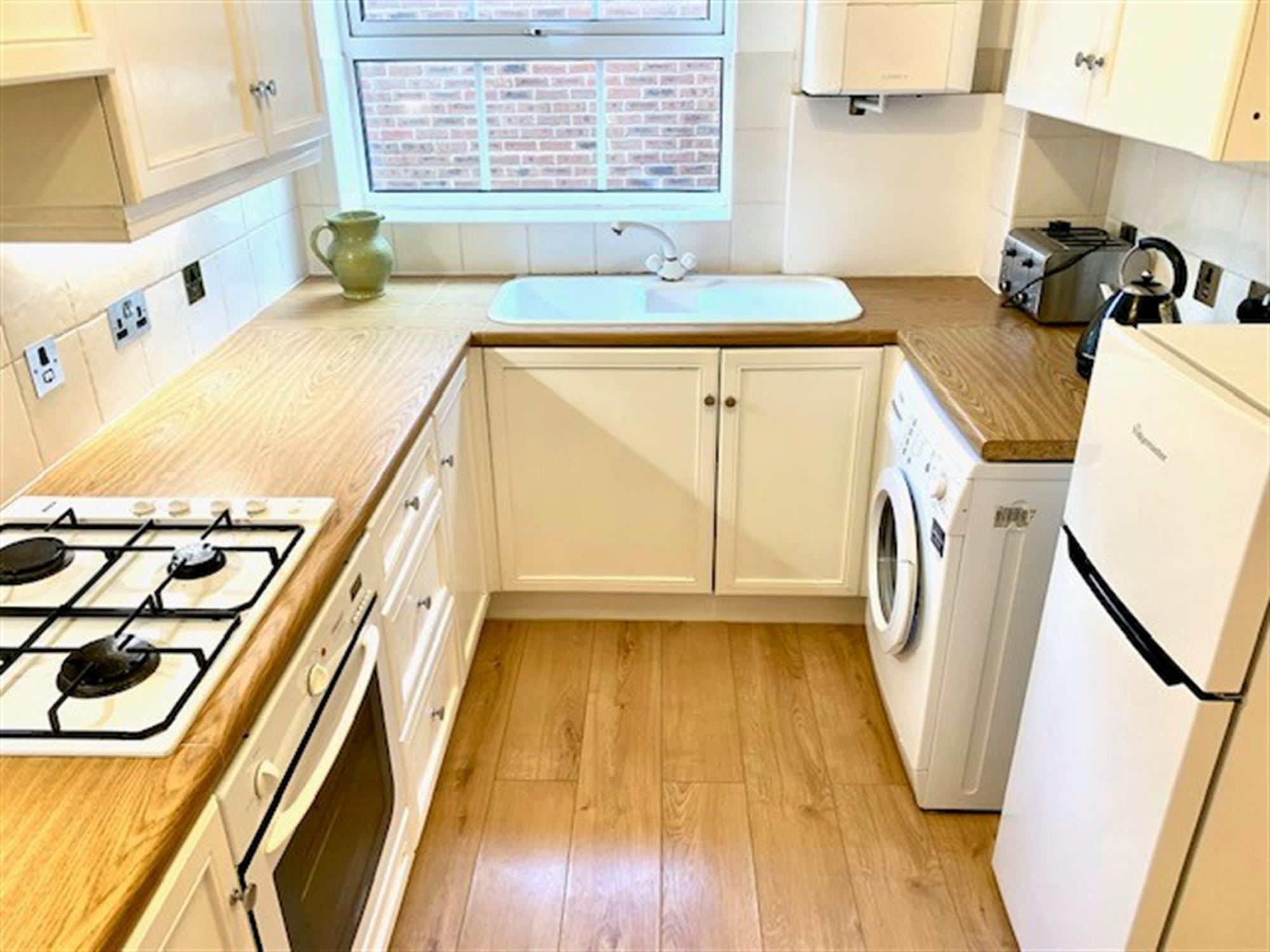 KITCHEN/DINER - Modern kitchen with various wall and base units. Gas hob, electric cooker, washing machine and fridge/freezer. Window. Space for dining room table. Laminate flooring.
