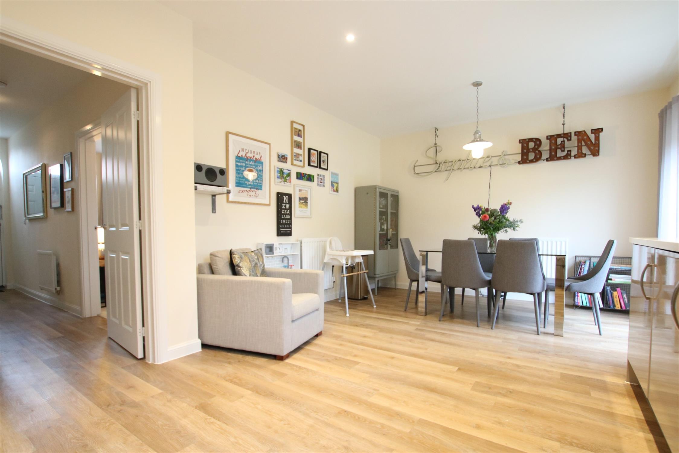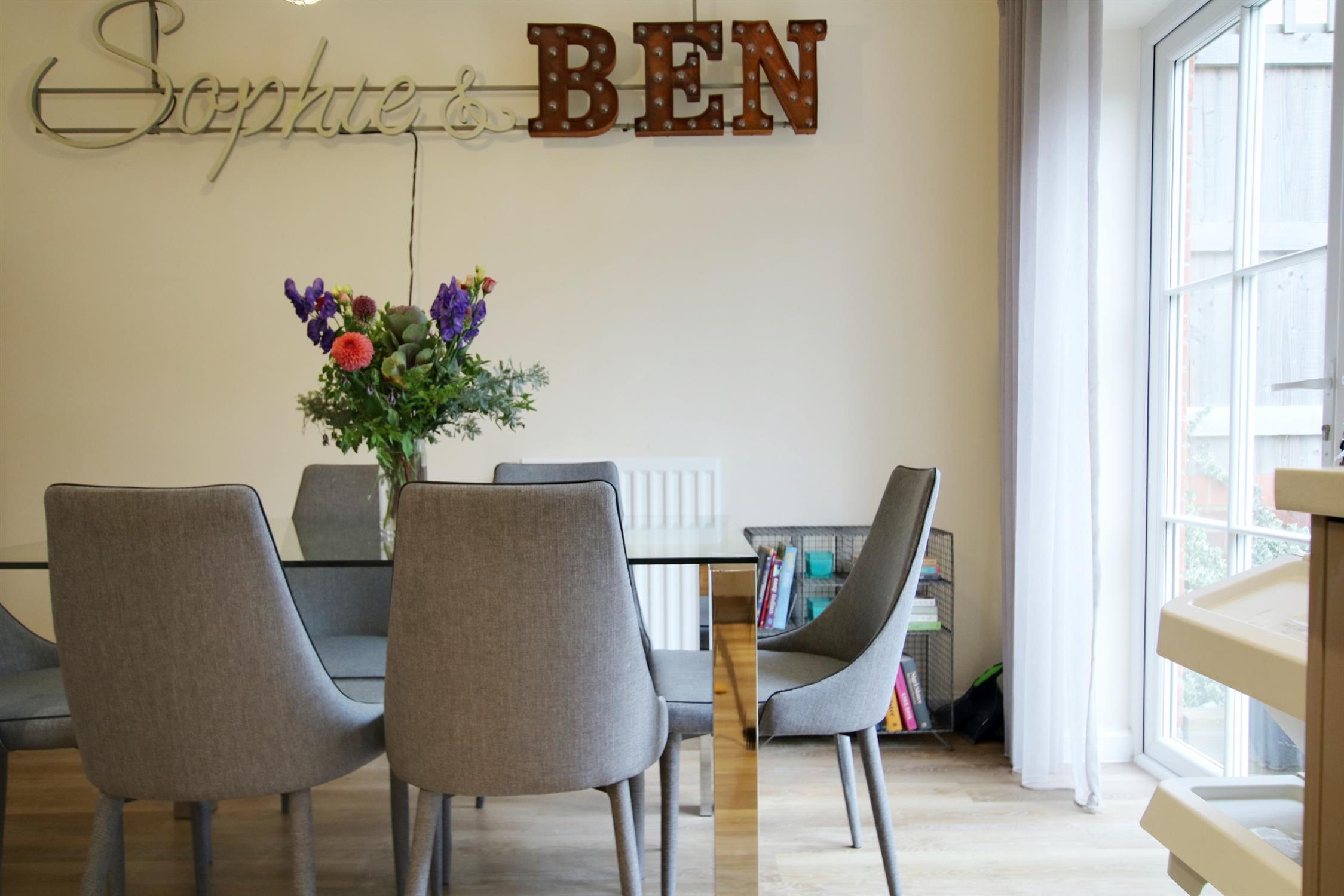 To the front of the house, there are paved steps bordered by mature shrubbery leading to the front door. The entrance hall provides access to the living room, kitchen/diner, downstairs WC, storage cupboard and stairs that rise to the first floor. The living room sits to the front of the property and is a generous size.