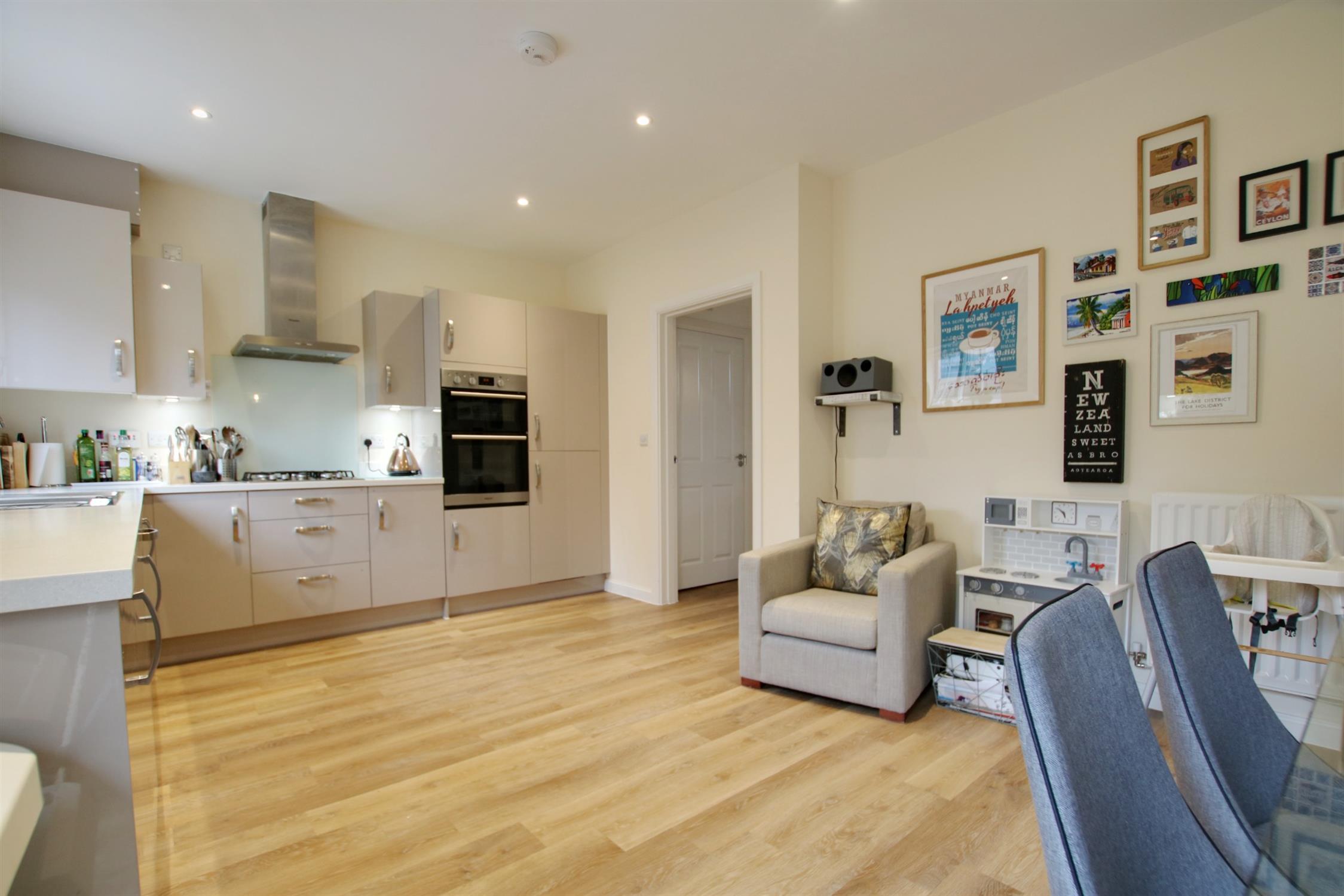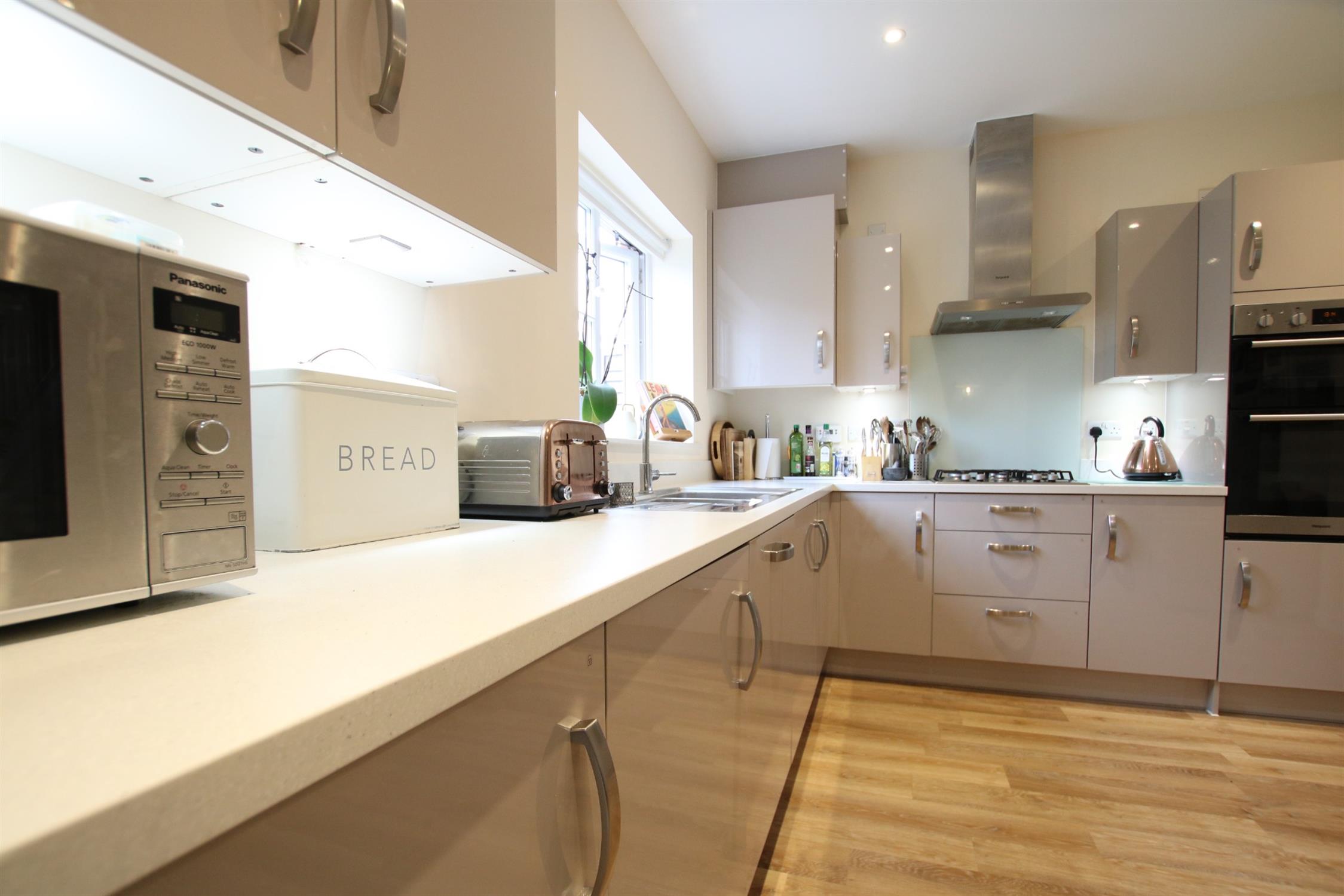 The contemporary kitchen is well fitted with a range of eye and low level units, double oven and integrated appliances. It is spacious in size and also offers ample space for dining furniture. Glass French doors open to the rear garden and allow light into the space.