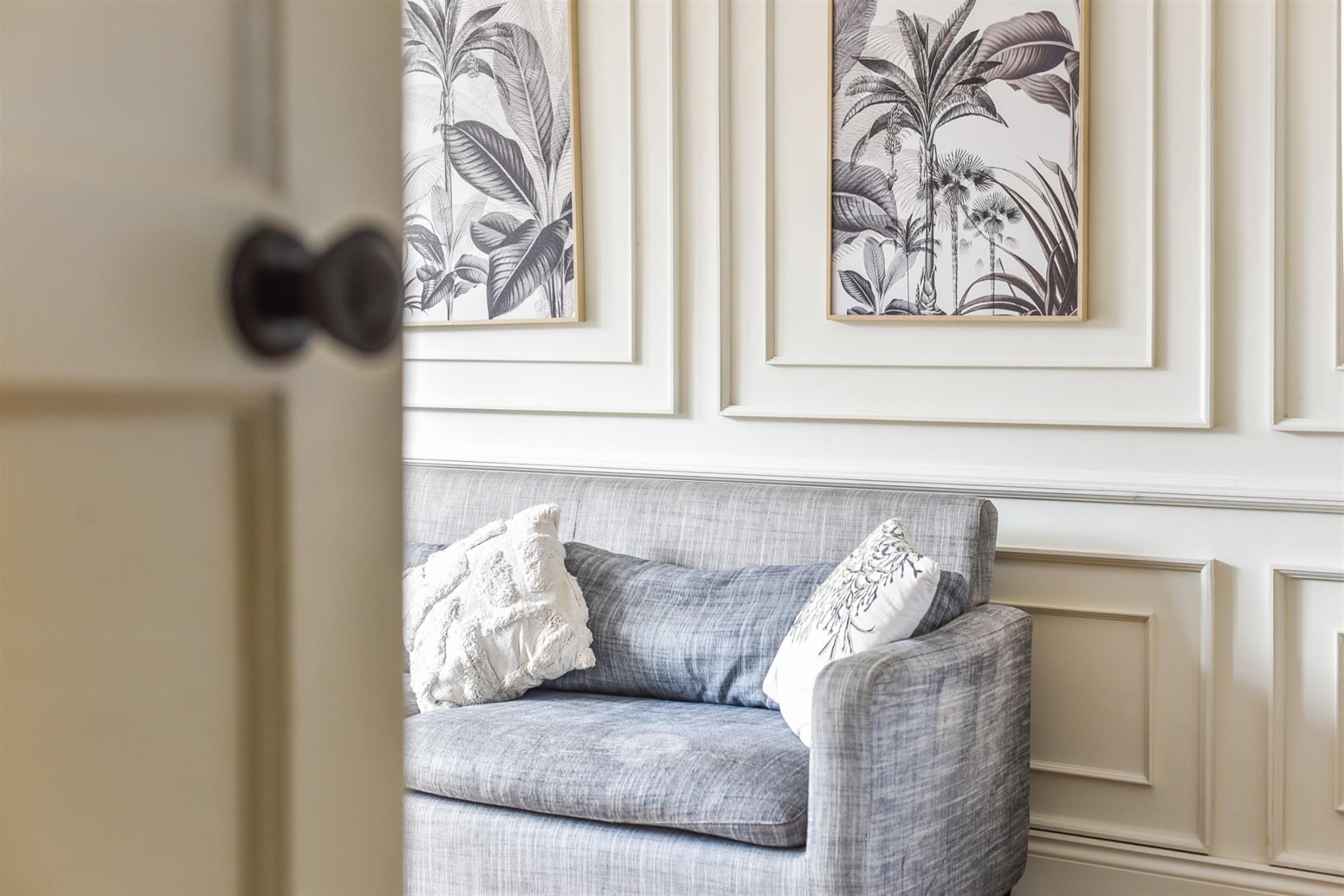 KitchenThe kitchen is neat and well-maintained, offering ample cupboard space and a generous larder for additional storage. It includes a Smeg gas oven, dishwasher, and a sink with drainer.