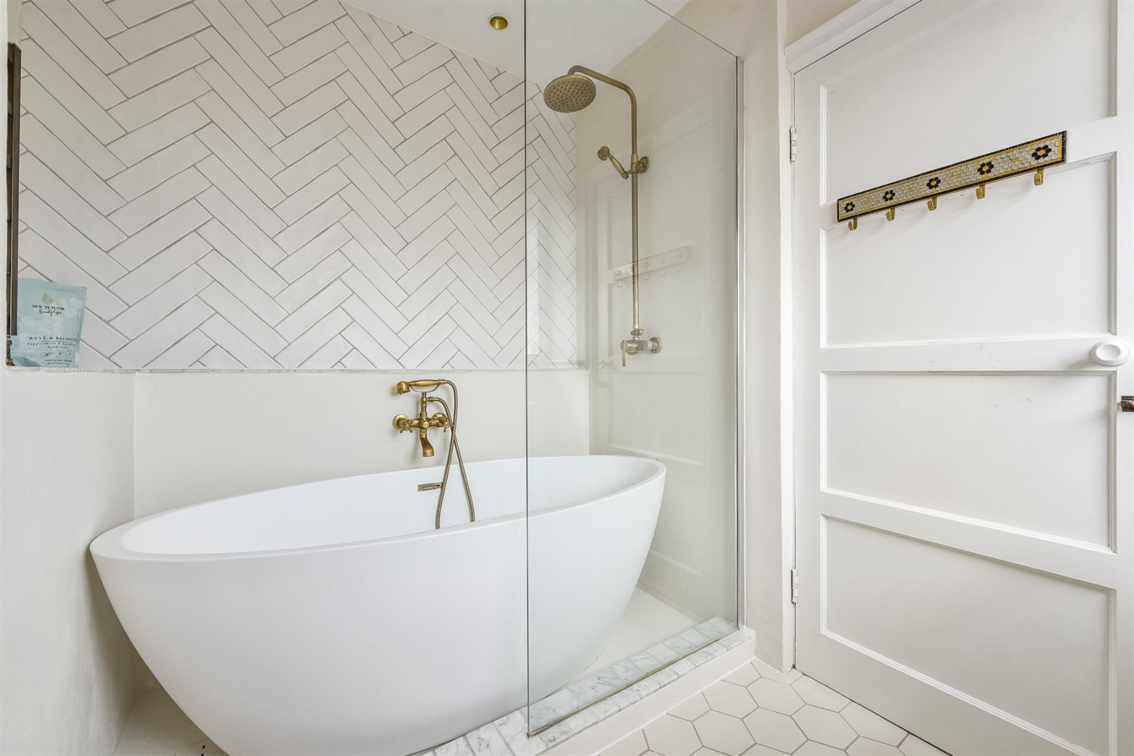 A modern and light bathroom, with a freestanding bath with overhead shower, and a toilet and basin set within a vanity unit. Electric underfloor heating powered by solar panels.