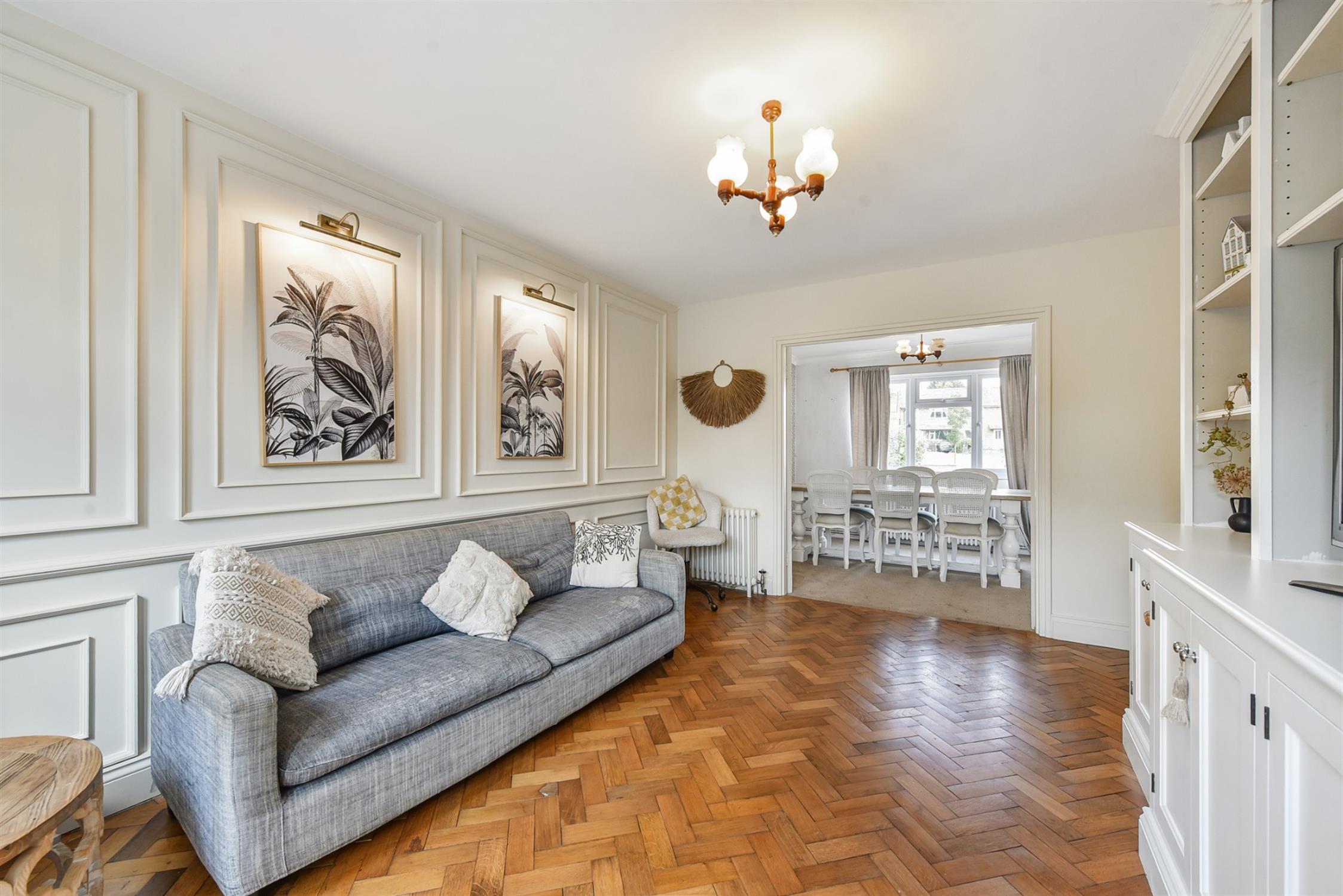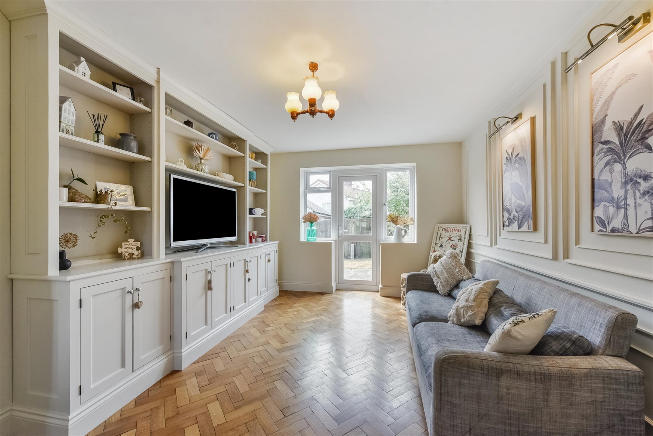 Parquet flooring, with additional matching flooring available to complete the dining room and hallway. The room features wall panelling, a built-in TV unit with shelving and storage—being left with the property—and a door leading out to the garden.