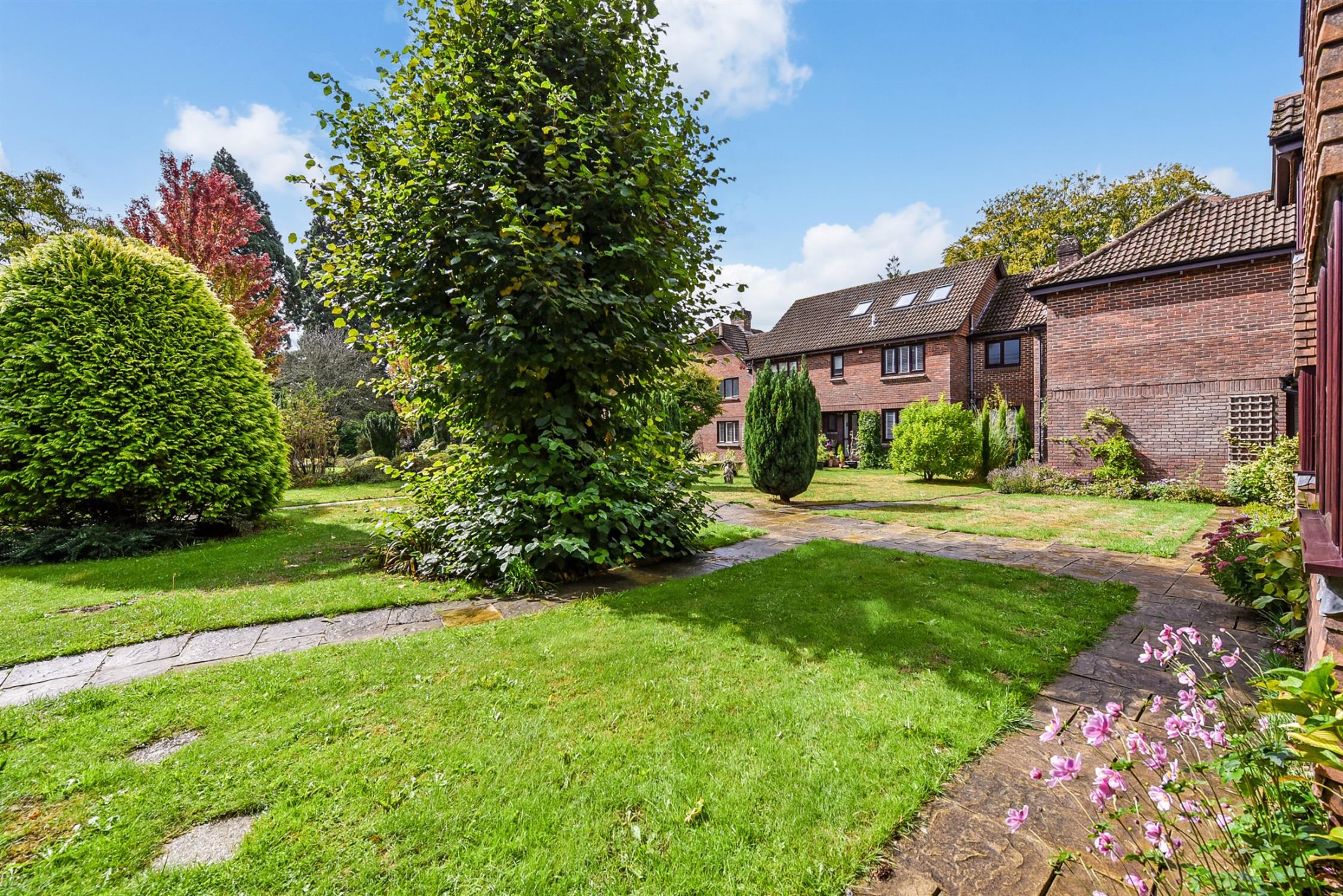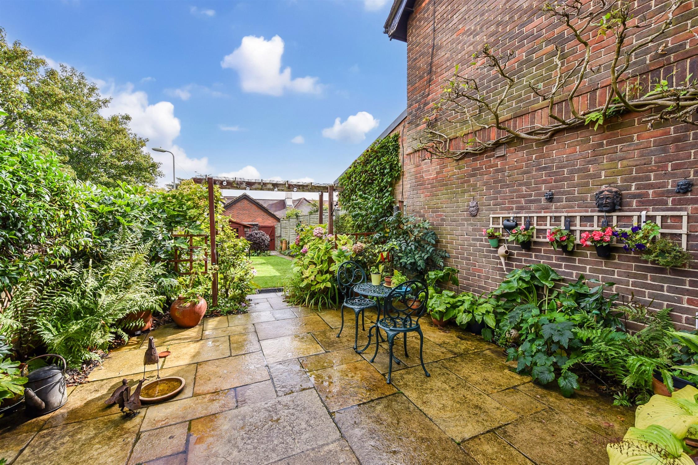 The property is approached via a beautifully maintained courtyard-style garden to the front, creating an inviting entrance.
