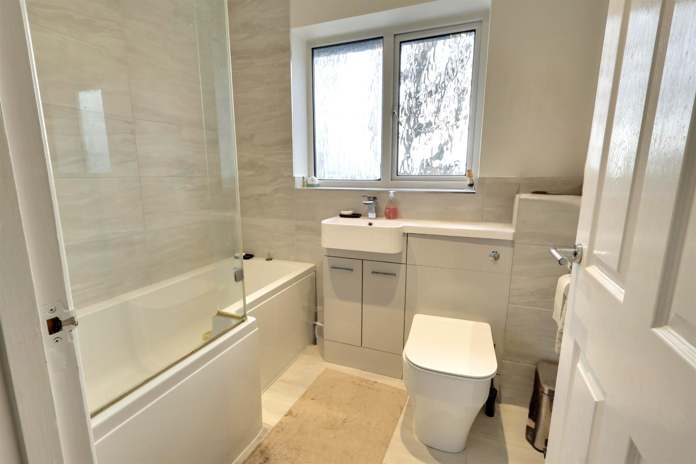 Opaque double glazed window to rear aspect. Panel enclosed bath with plumbed rain head shower over. Low level W.C. Pedestal hand basin, shaver point. Part tiled walls. Radiator.