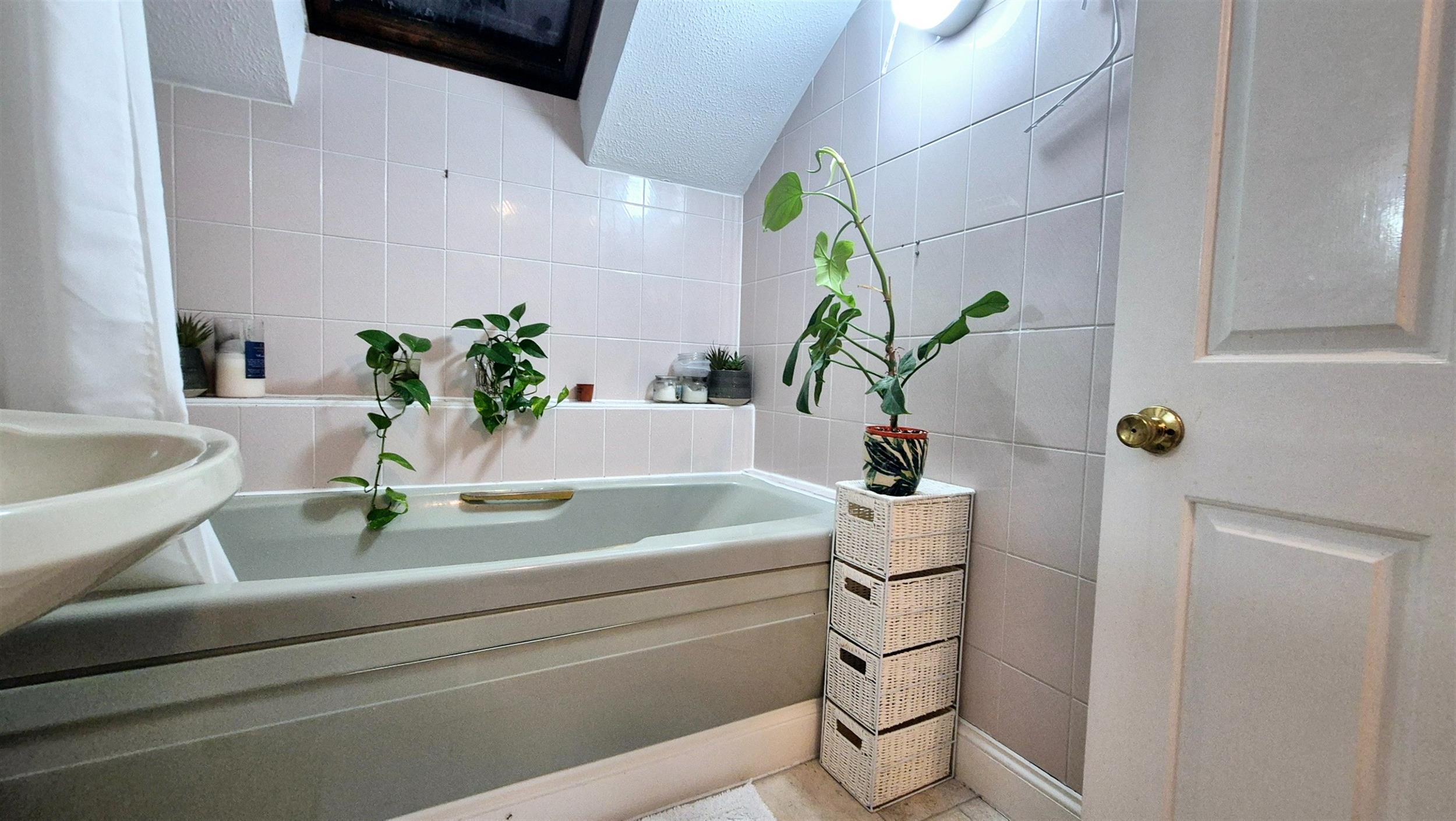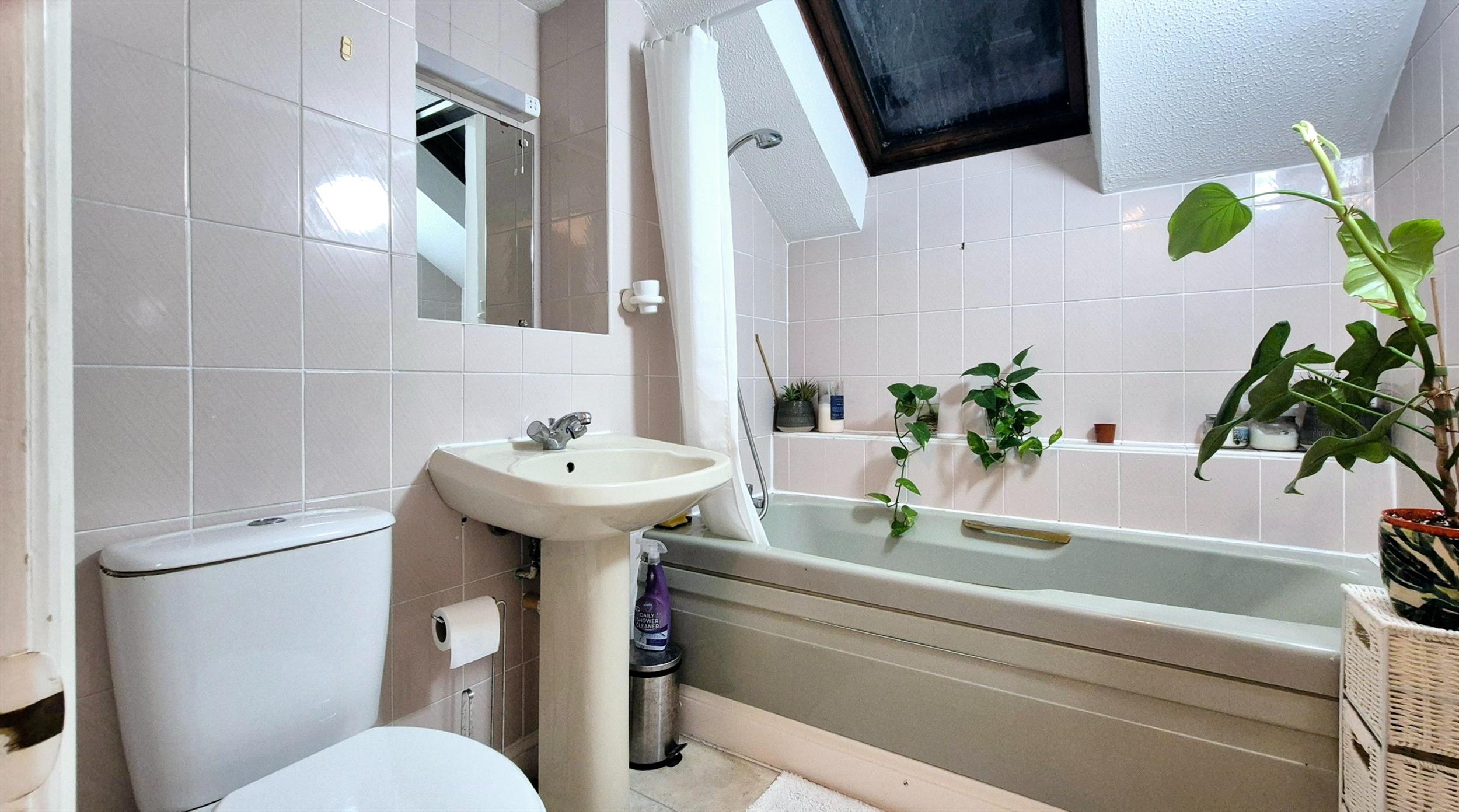 BATHROOM - Bathroom with sink, toilet and shower over bath. Velux window to rear.