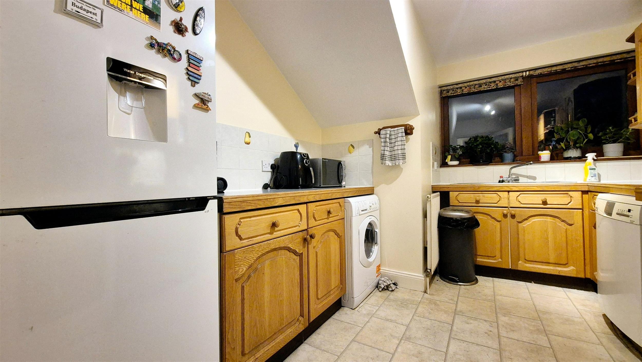 KITCHEN – Various wall and base units. Appliances include: Electric oven, electric hob, Washing Machine, Dishwasher and Fridge/freezer. Window.