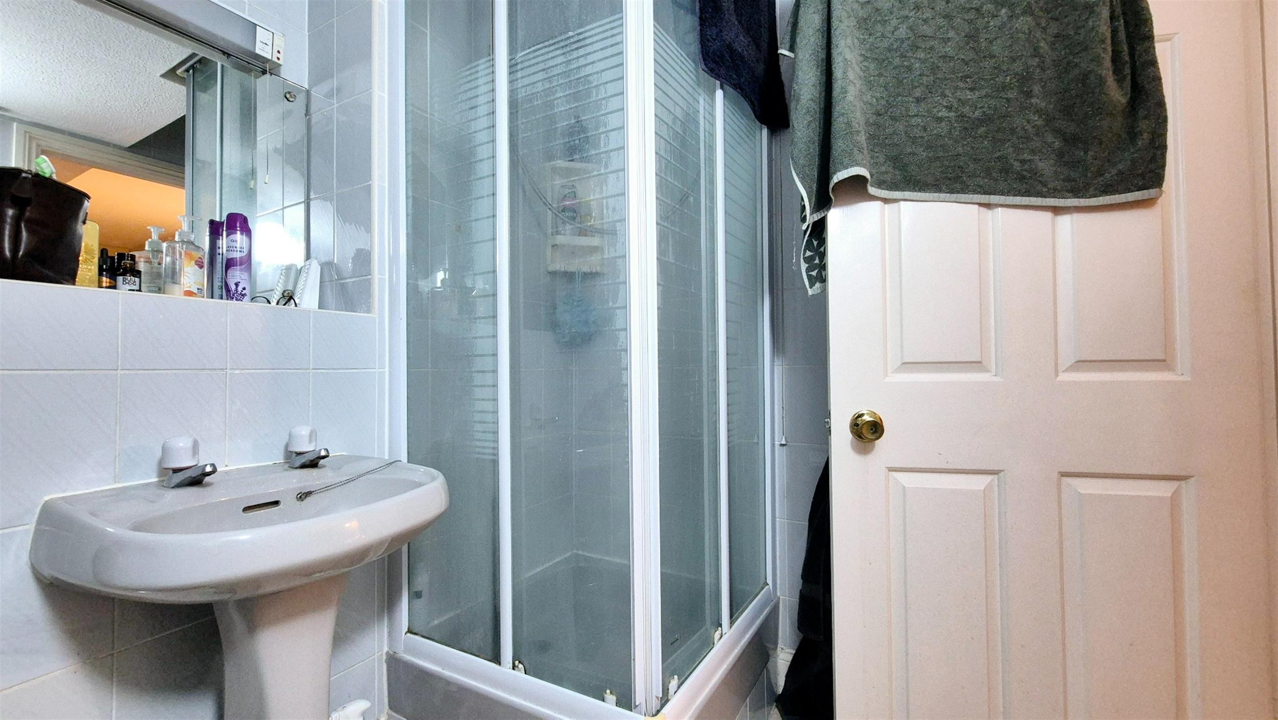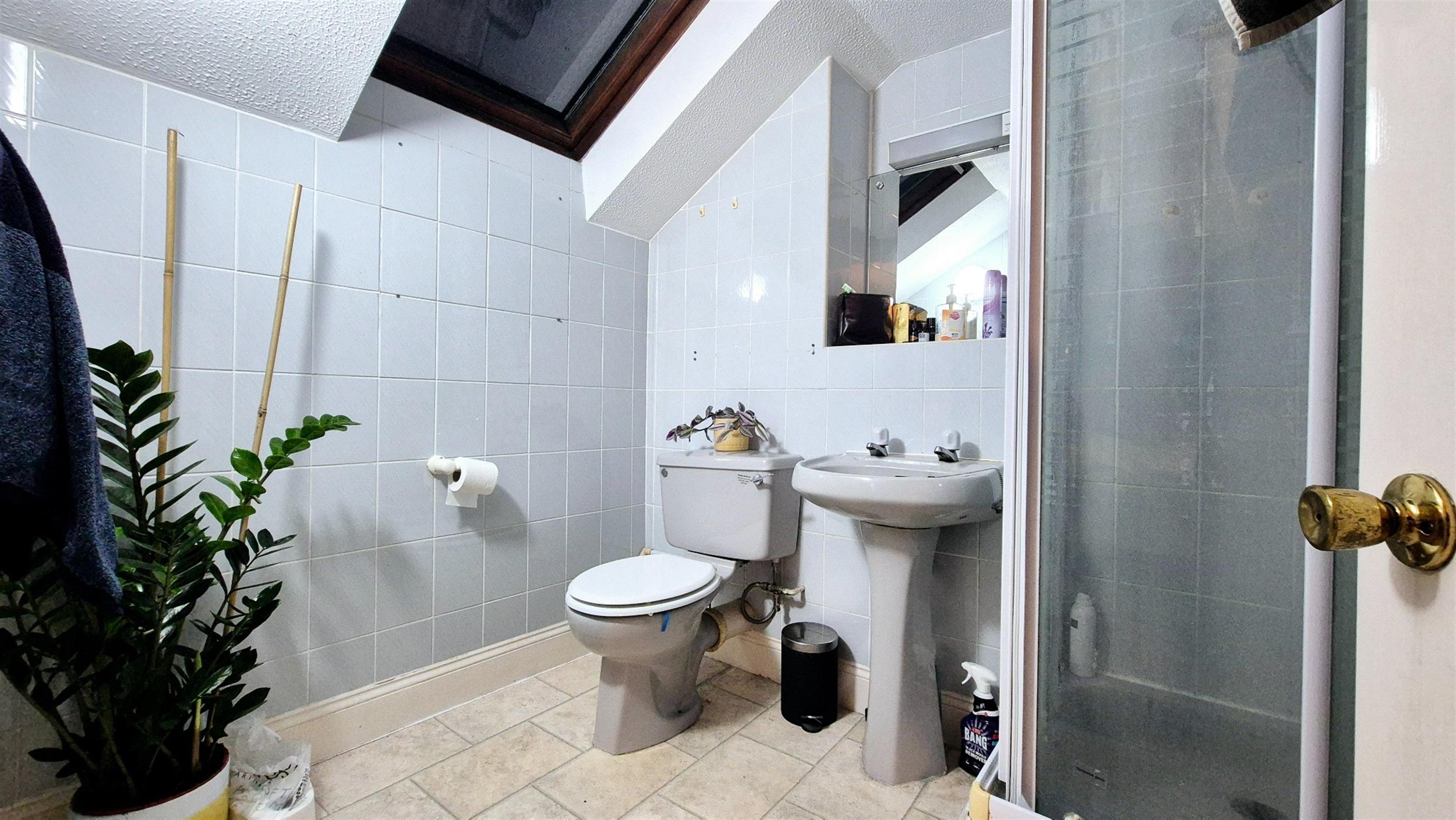 ENSUITE- Grey suite with shower cubicle, sink and toilet. Velux window.