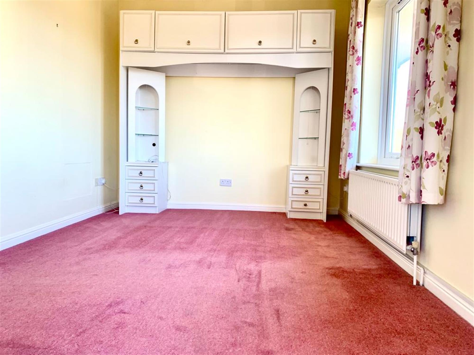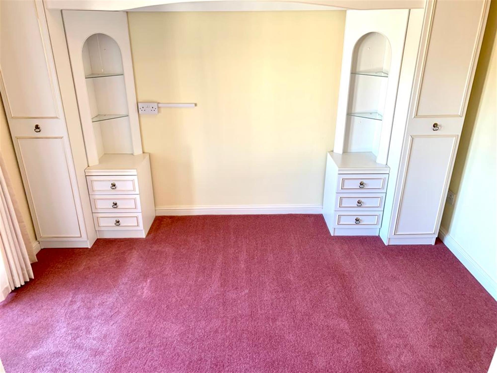 Bedroom 2 - carpeted, double in size with built in wardrobe, over bed wardrobe/cupboards and door to balcony.