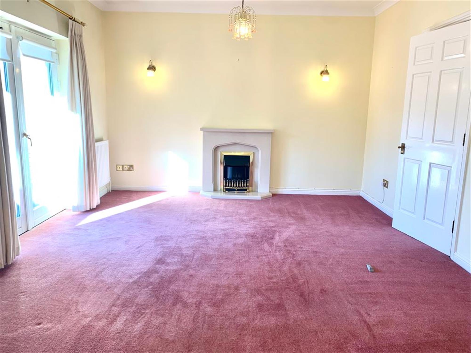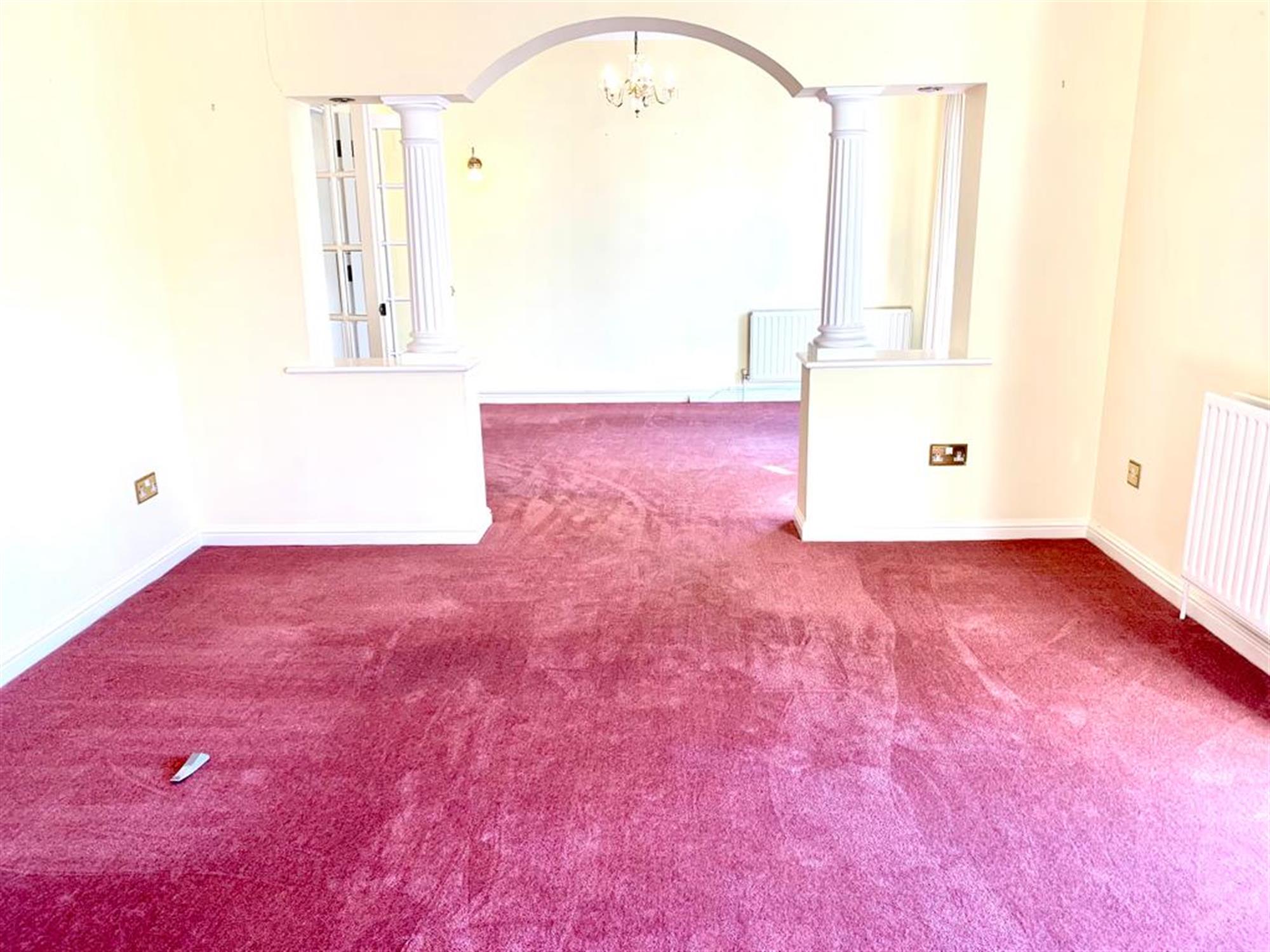 Lounge - carpeted with electric fire and door to balcony and feature archway leading into dining room.