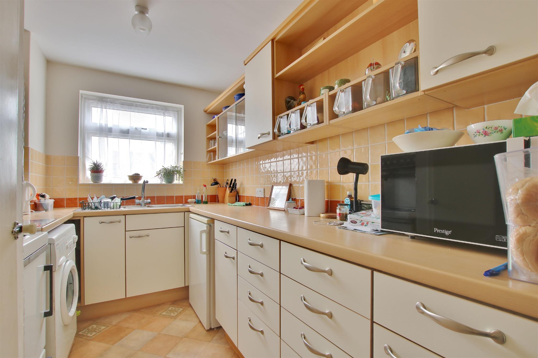 A range of wall and base cupboards with work surfaces over. One and a half bowl stainless steel sink unit with drainer. Space for oven and fridge/freezer. Plumbing for washing machine. Airing cupboard. Store cupboard. Double glazed window.