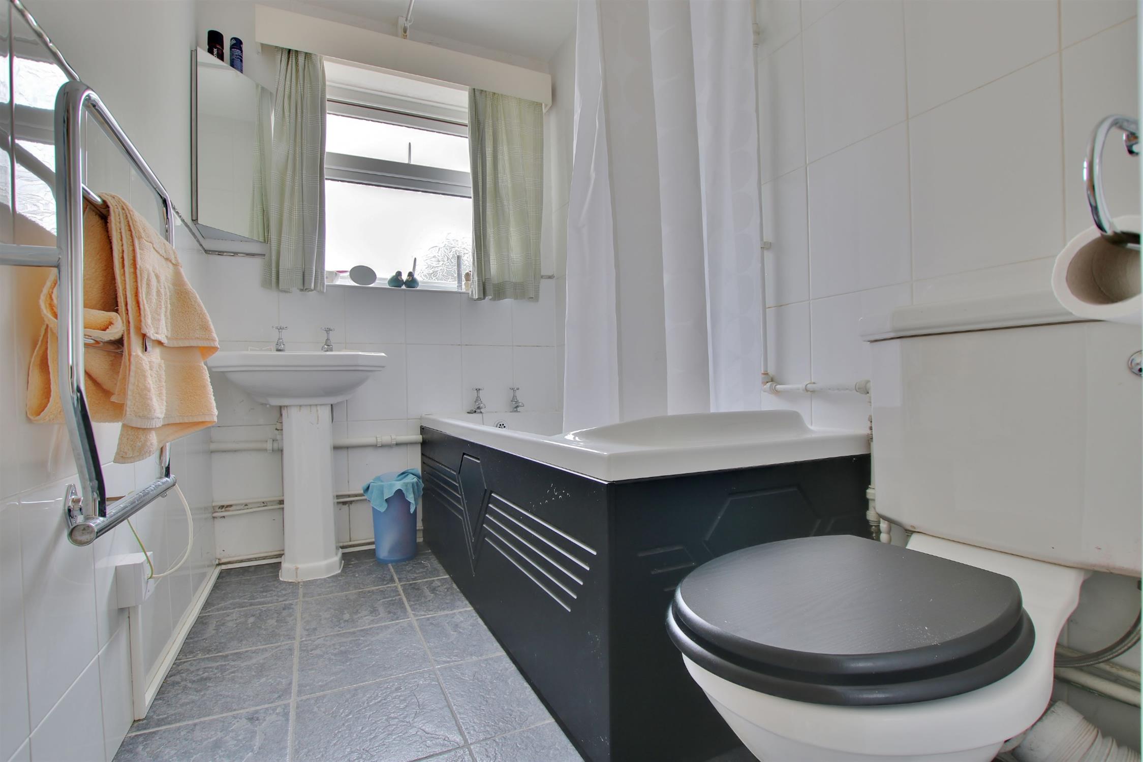 Panelled bath with shower attachment over, w.c. and ceramic sink. Heated towel rail. Tiled flooring. Obscure double glazed window.