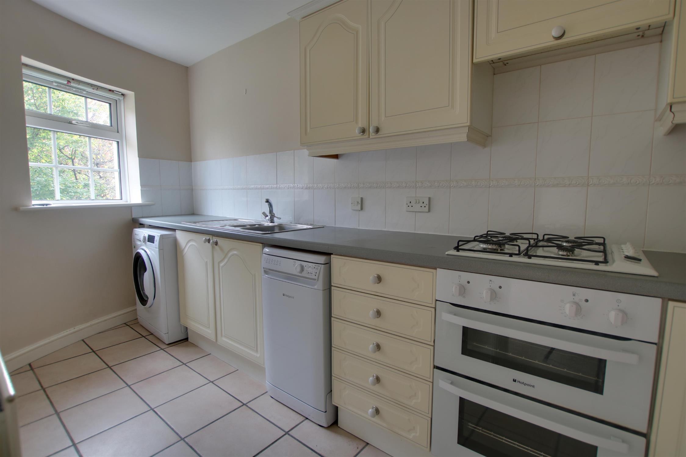 Double glazed window to front aspect. Smooth ceiling. Single drainer one and a half bowl sink unit with mixer tap and cupboard under. A range of matching eye level and base mounted units with roll top work surface over. Built-in double oven with fitted four ring gas hob and extractor over. Space and plumbing for washing machine and slimline dishwasher. Space for fridge/freezer. Radiator. Tiled flooring.