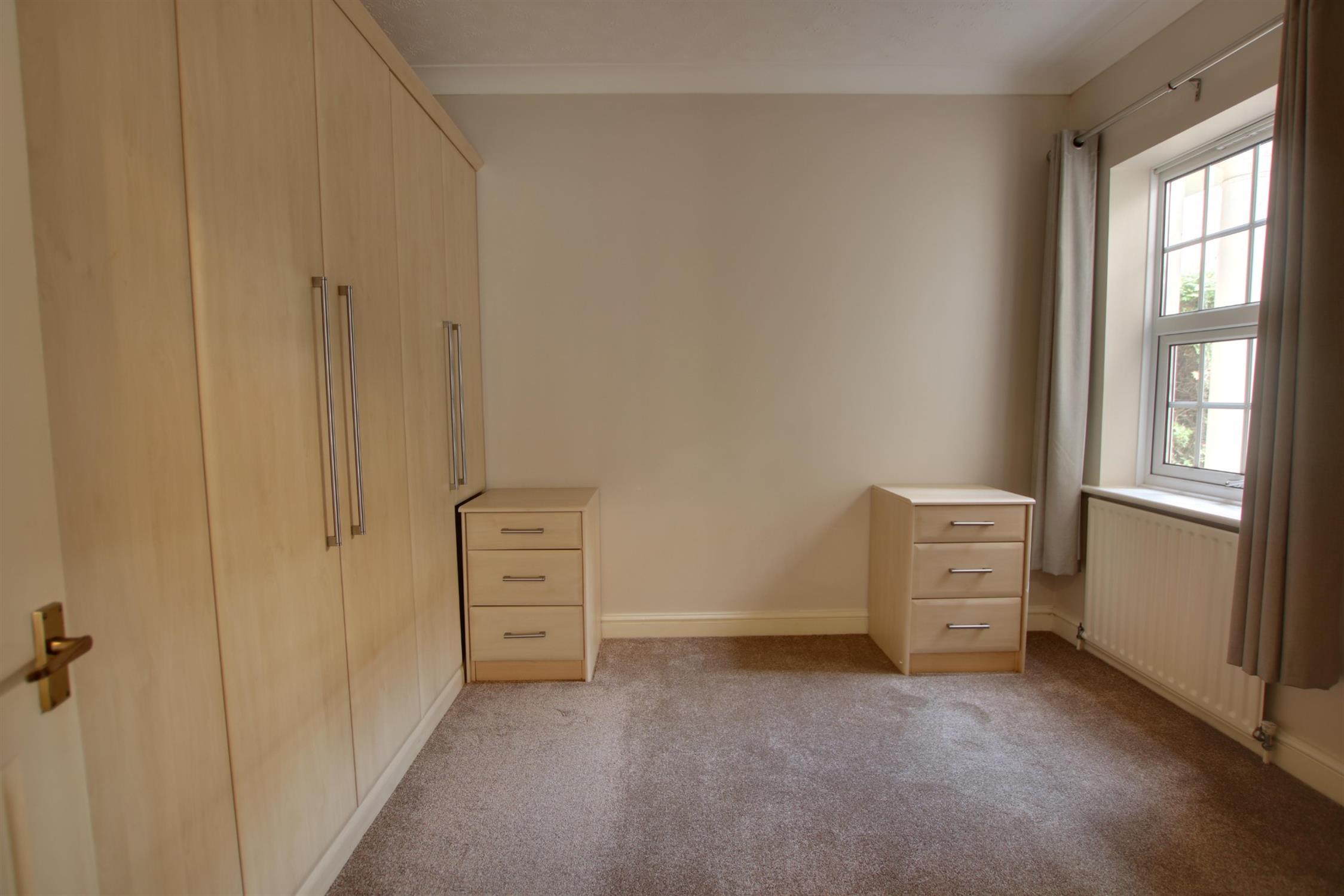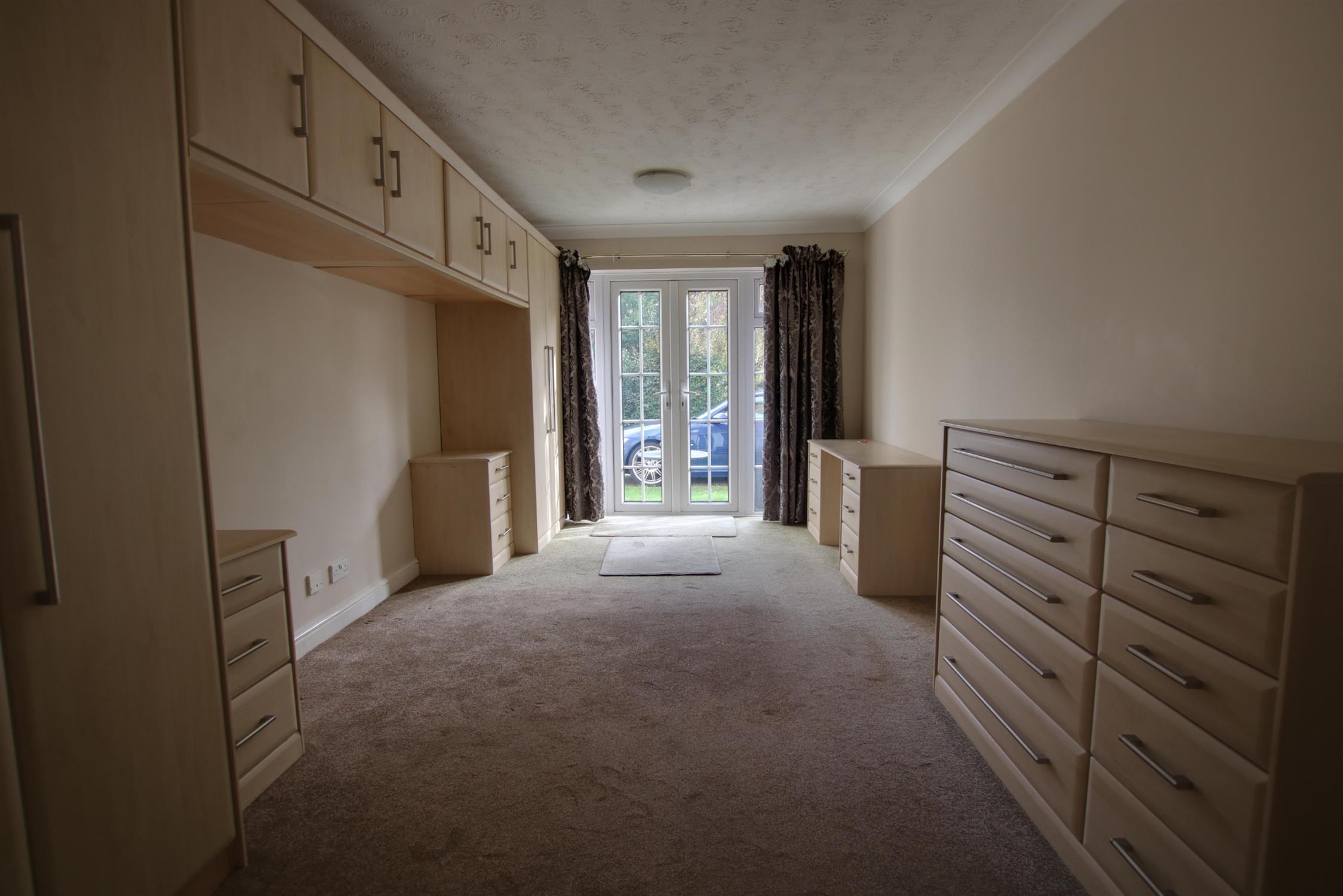 Double glazed French doors to front aspect with double glazed windows to front aspect. Coving to textured ceiling. Radiator. Fitted wardrobes and drawers. Cupboard housing wall mounted combination boiler. Door to:-