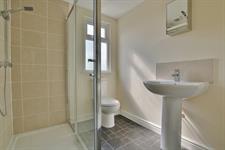 Walk-in shower cubicle. WC. Ceramic sink. Heated towel rail. Frosted double glazed window.