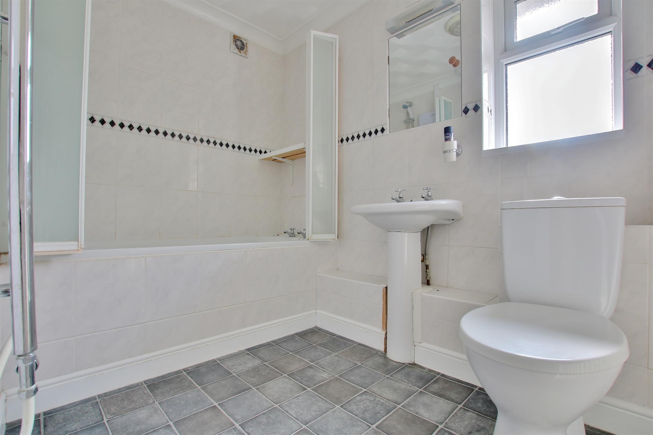 Panelled bath with screen and shower attachment. Ceramic sink. WC. Heated towel rail. Radiator. Tiled walls. Frosted double glazed window.