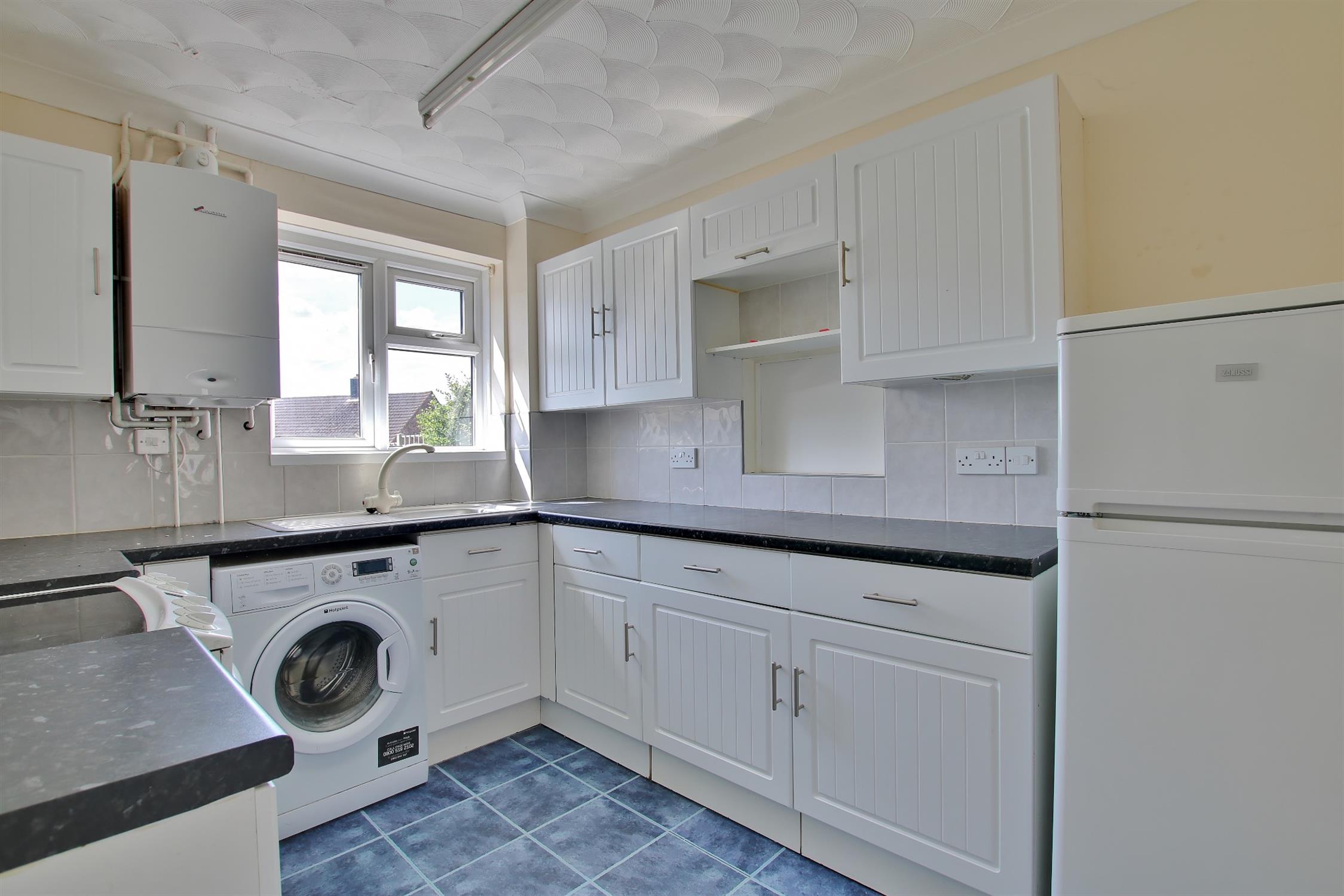 A range of wall and base cupboards with work surfaces over. Inset sink with drainer. Plumbing for washing machine. Space for oven with extractor fan over. UPVC door providing access to lobby with storage areas.