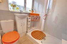 Upvc double glazed and obscured window, electric shower with glass screening, sink with mixer tap and built in cupboard, dual flush toilet, head height fitted mirror cupboard.