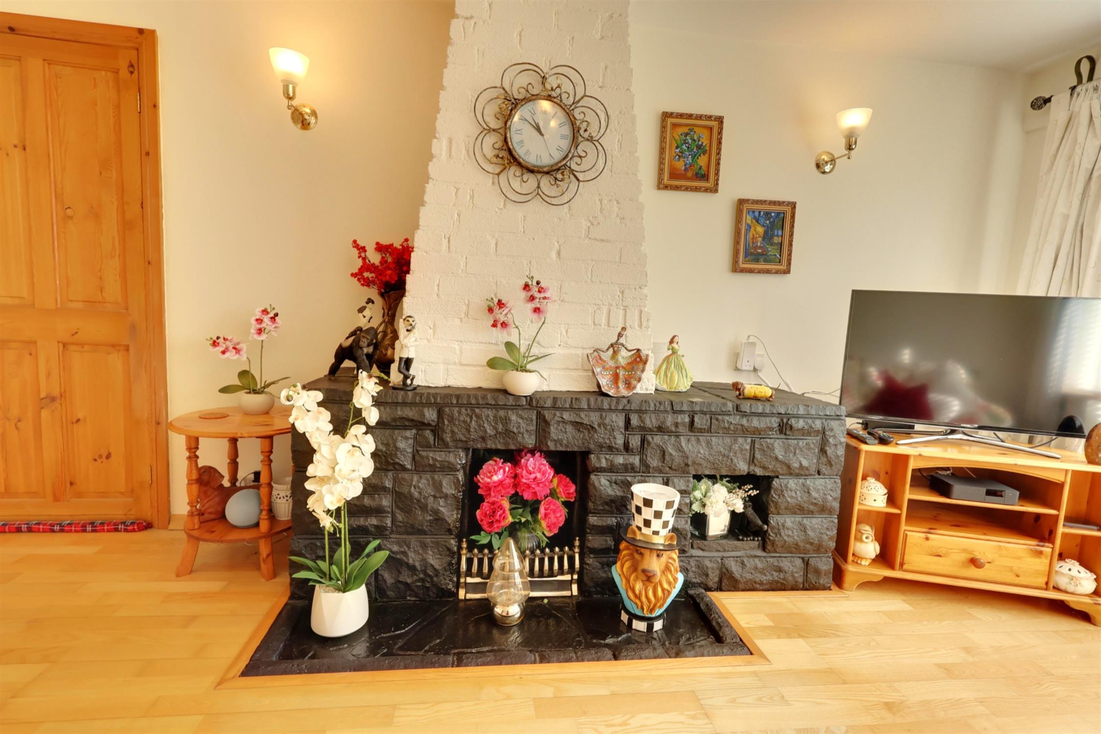 Brick feature fireplace, radiator, Upvc double glazed windows and double doors to a balcony style seating area to appreciate the farmland views.