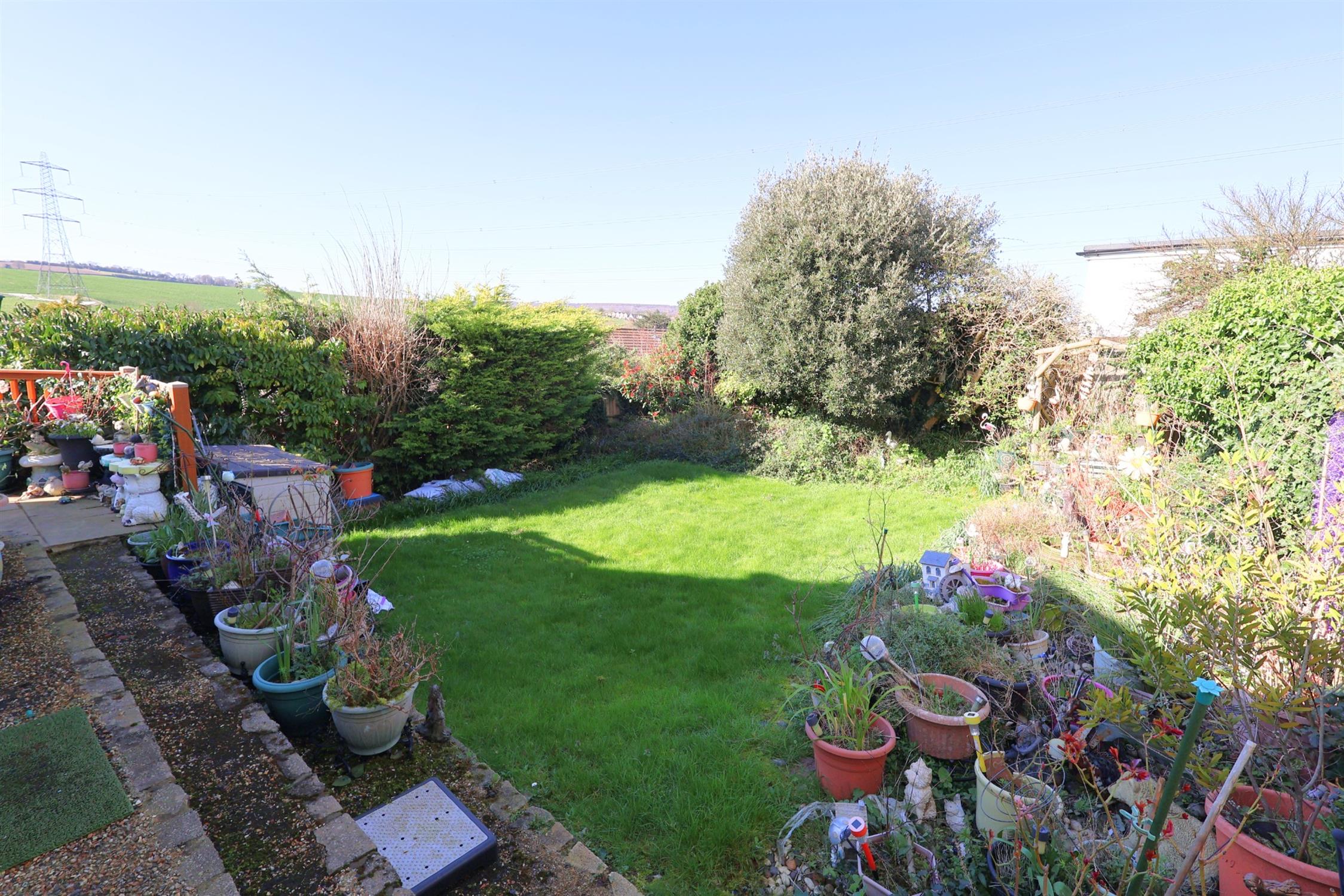 Mainly laid to lawn offering the option of further parking if required, front path to side gate, front door and terrace. Steps down to the garage and driveway parking for two vehicles.