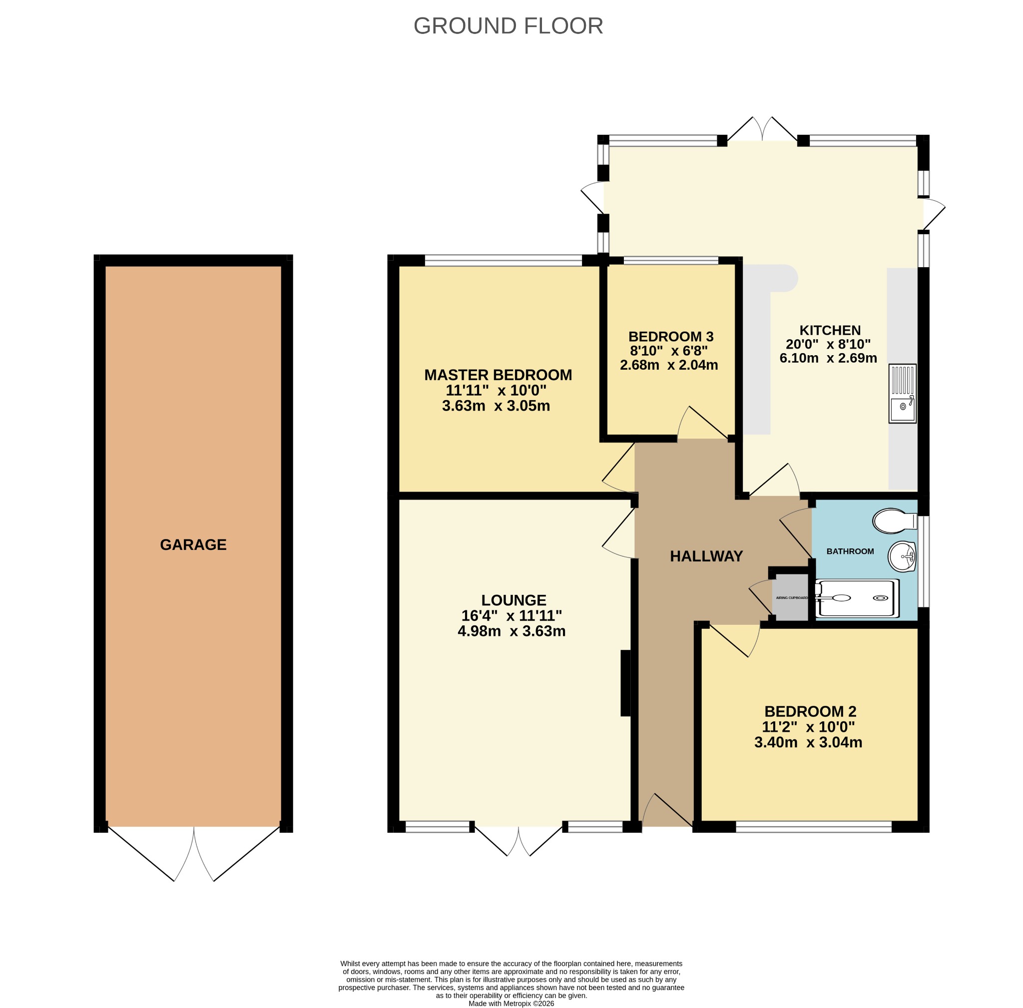 Upvc front door into a hallway with radiator, loft hatch, airing cupboard and power points.