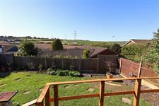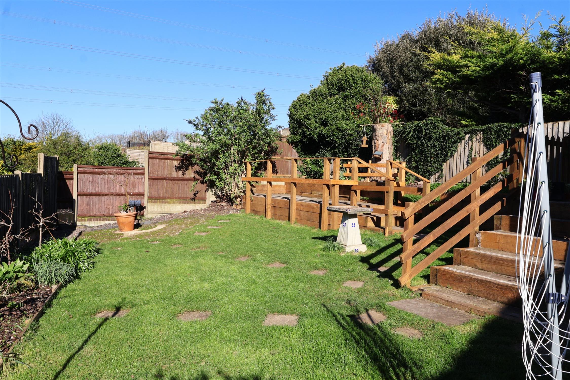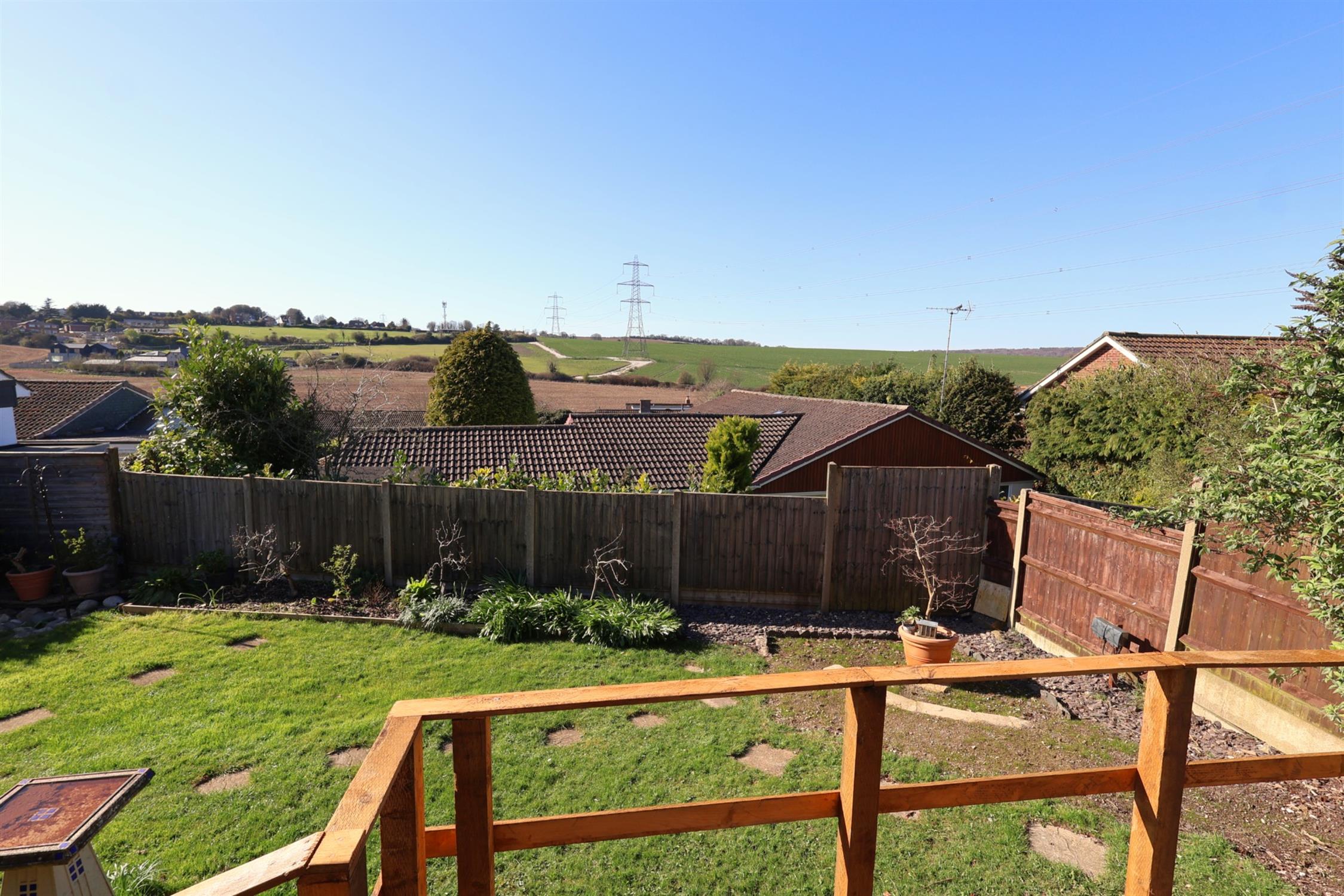 REAR GARDEN : Landscaped and lawned with views from raised entertaining terrace of open fields and farmland. Flower and shrub borders. 2 side gates leading to the front. Door to an undercroft storage area.