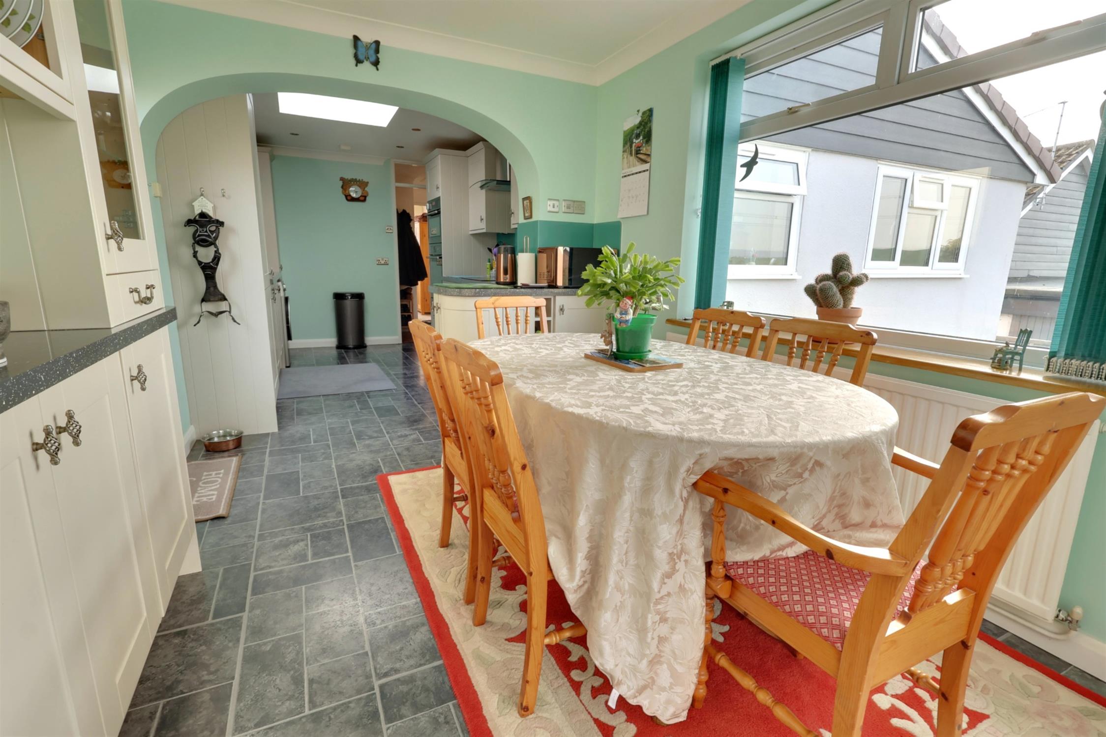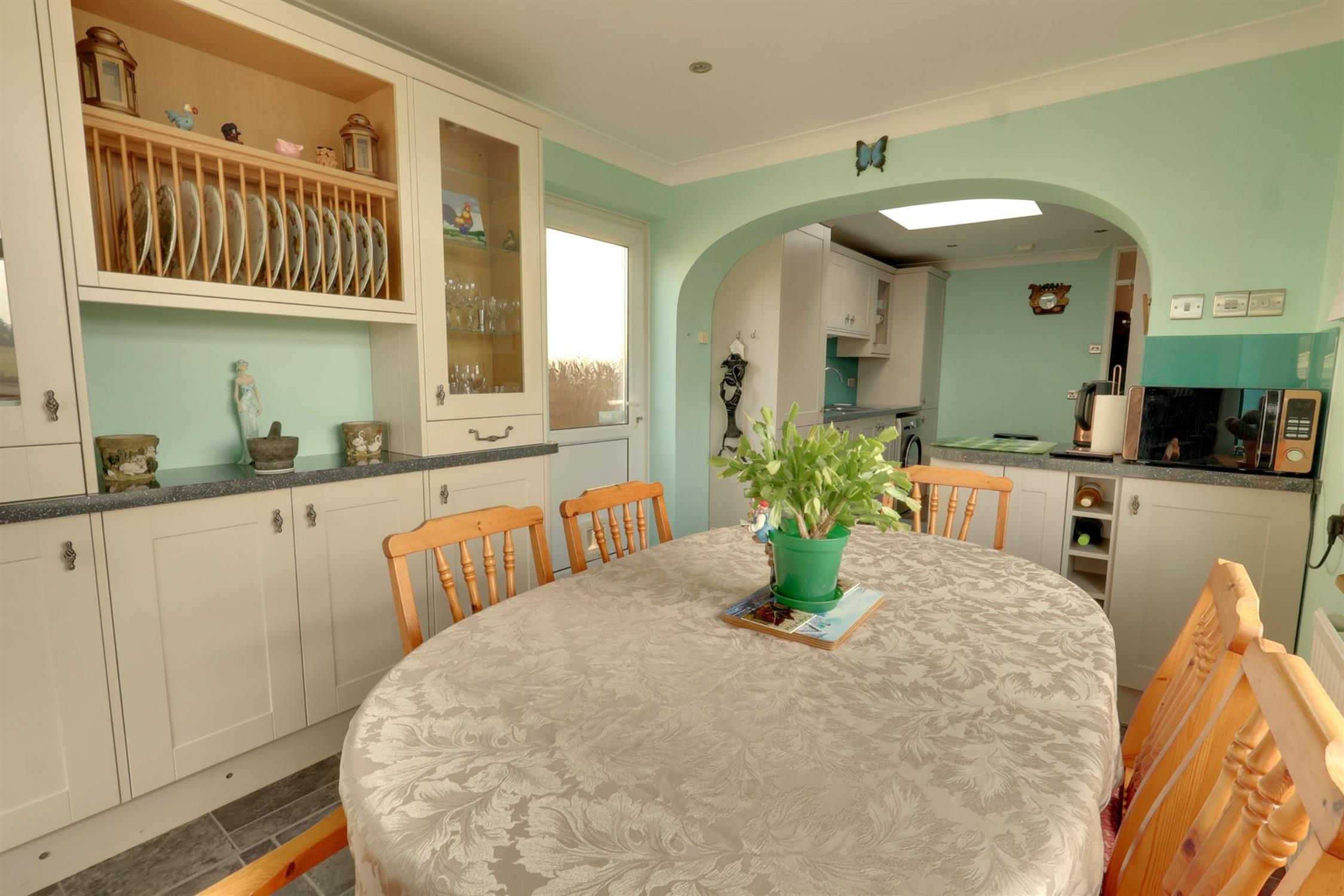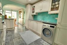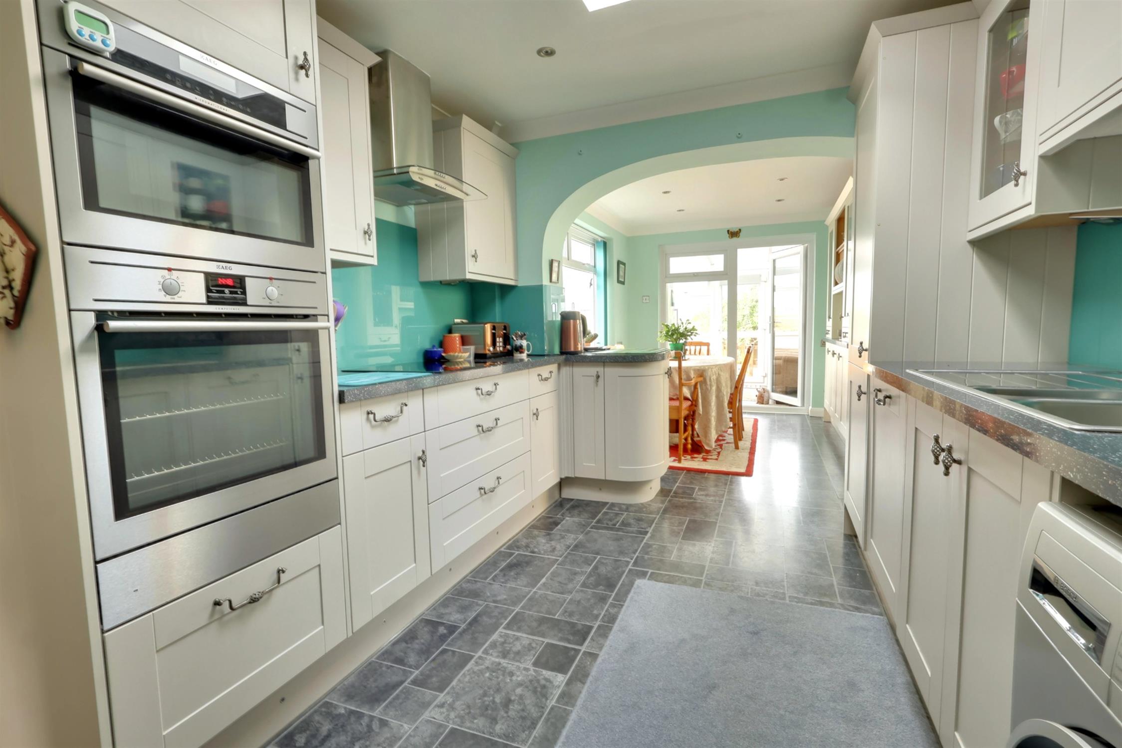 KITCHEN/DINING ROOM : Spacious fully fitted open-plan kitchen dining room with range of integrated appliances and views from the dining area. 'Shaker' style wall and base units with illuminated contrasting work surfaces and and glass splashback surrounds. 1 1/4 sink and drainer with swan neck mixer taps over. Integrated fridge, freezer, dishwasher. Eye level double oven and microwave combi, induction hob with extractor fan over. Concealed combination boiler. Fitted dresser and display to dining area. Obscured double-glazed door to side, further double-glazed window and door to conservatory.
