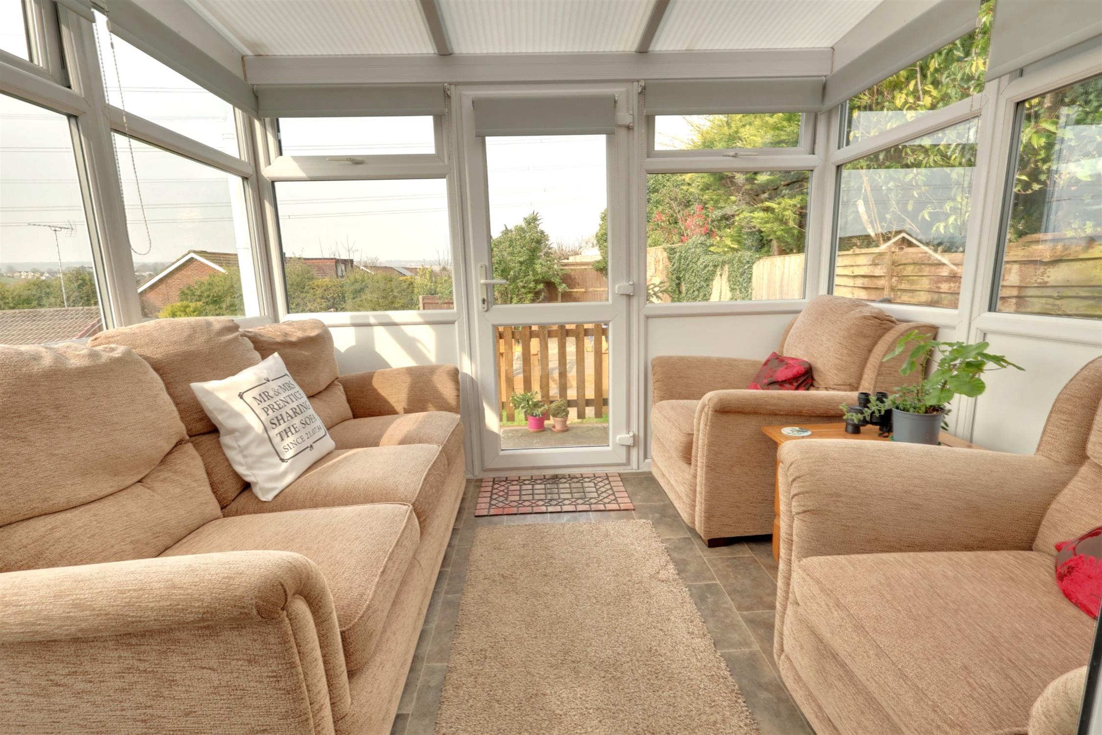CONSERVATORY : Upvc double-glazed construction with windows and door to garden offering views of open farmland.