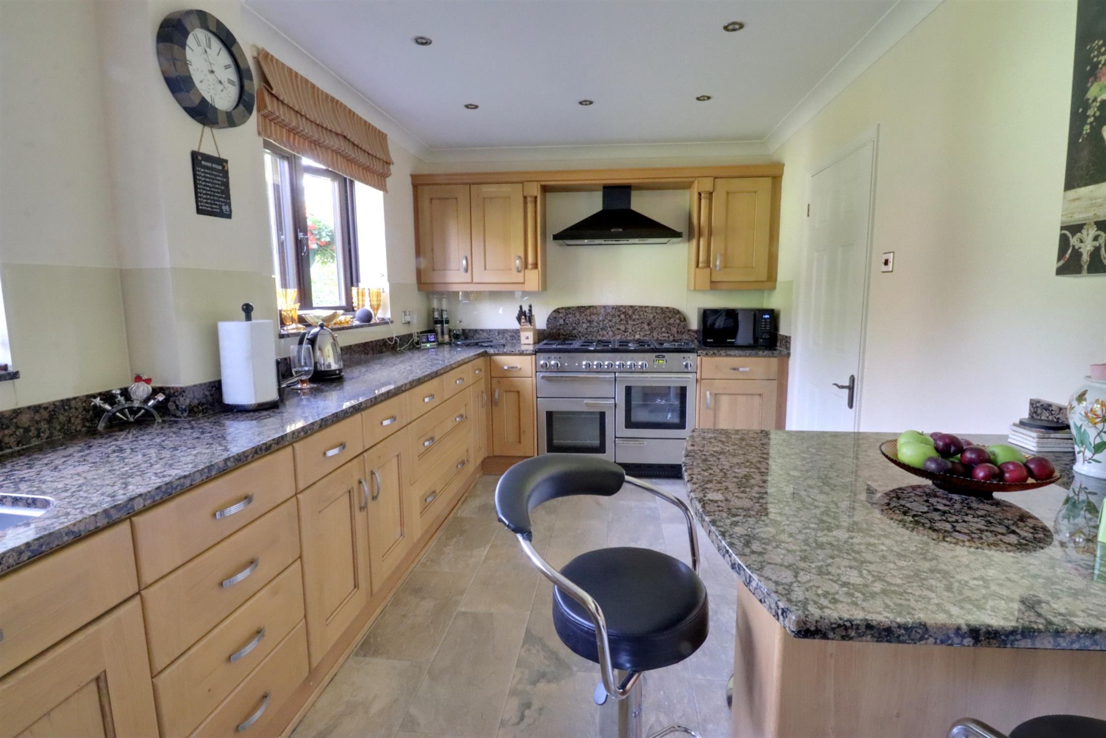 Fitted with a comprehensive range of wall and base units with worksurfaces over, breakfast bar, gas range cooker with extractor hood over, integral dishwasher and fridge/freezer, inset one and a half bowl stainless steel sink with insinkerator waste disposal, two rear aspect double glazed windows, built in larder, radiator, tiled flooring door to the utility room.
