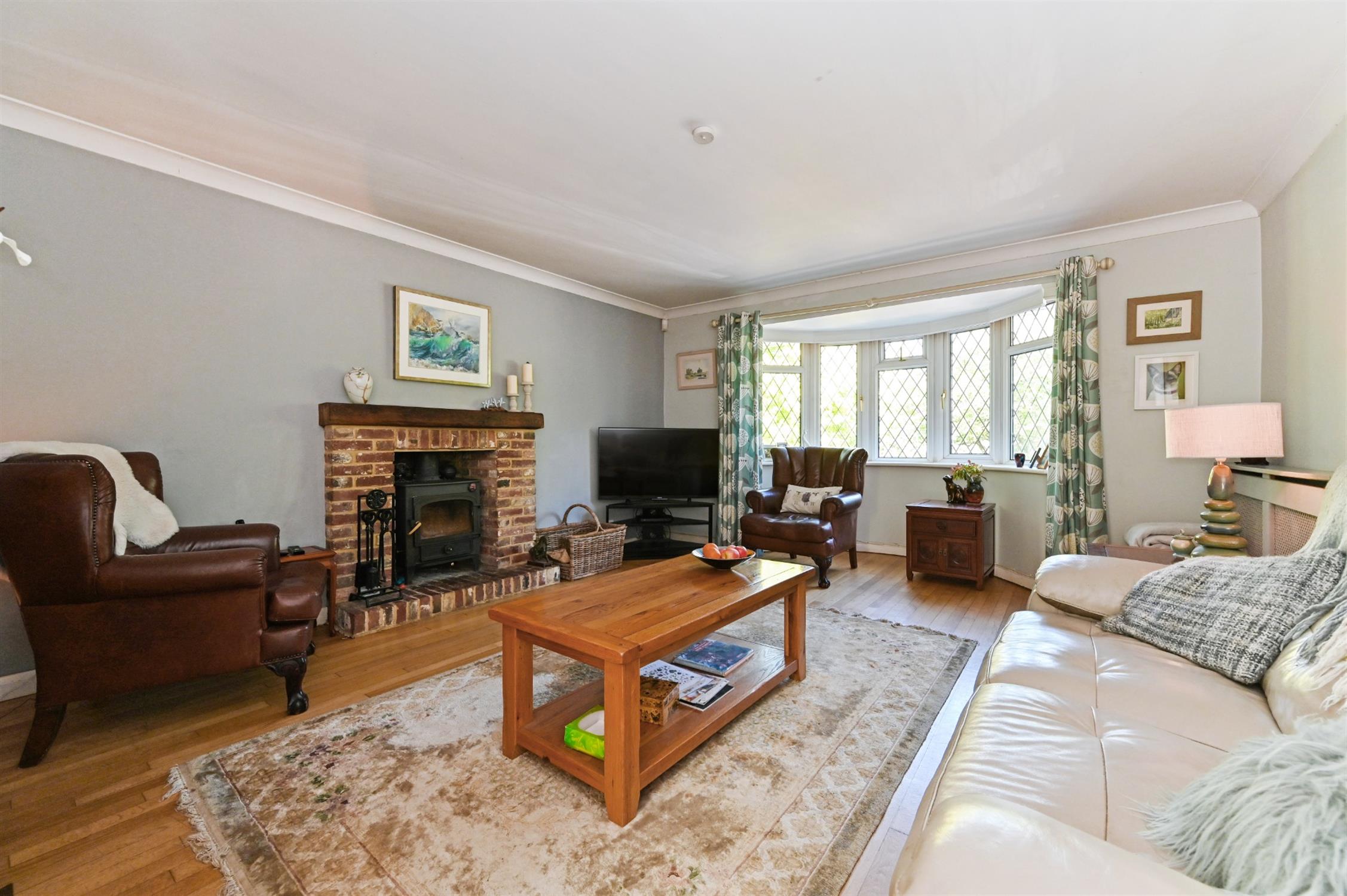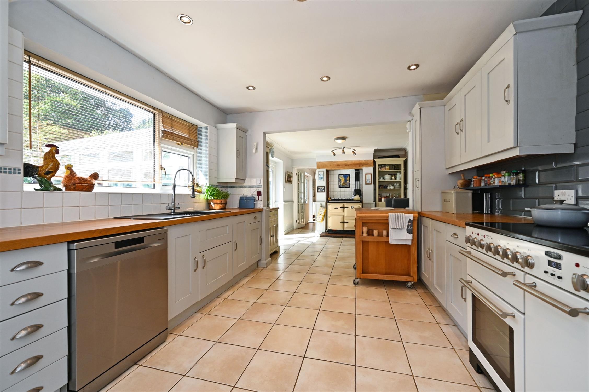 The sitting room has a circular bay window to the front and a feature brick fireplace with inset wood burning stove, and to the rear of the property is a lovely kitchen/dining room which is beautifully fitted with an extensive range of modern grey-fronted wall and base units above which are solid wood worktops. The gas-fired Raeburn supplies the heating and hot water systems providing an additional cooking facility if required, and double doors open into the large conservatory from which is a lovely outlook over the gardens. The ground floor also contains two double bedrooms, one of which has an en-suite bathroom, and a snug.