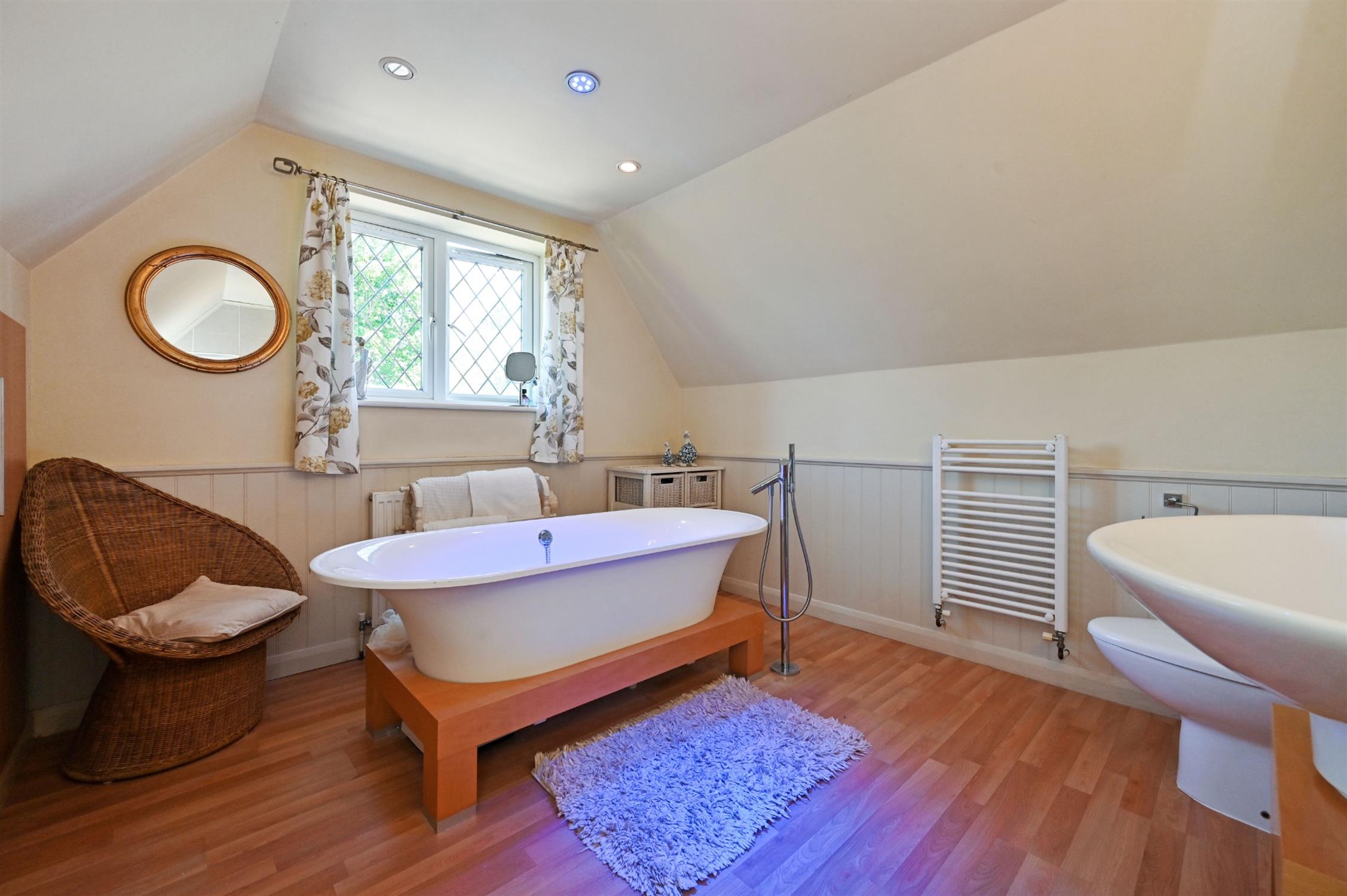 On the first floor are two additional large bedrooms, both with wardrobes fitted by Hammonds and each with en-suite facilities: The master bedroom suite has an adjoining dressing room with en-suite shower room whilst bedroom two, a large double room, has a stylish en-suite bathroom with raised bath and contemporary mood lighting.