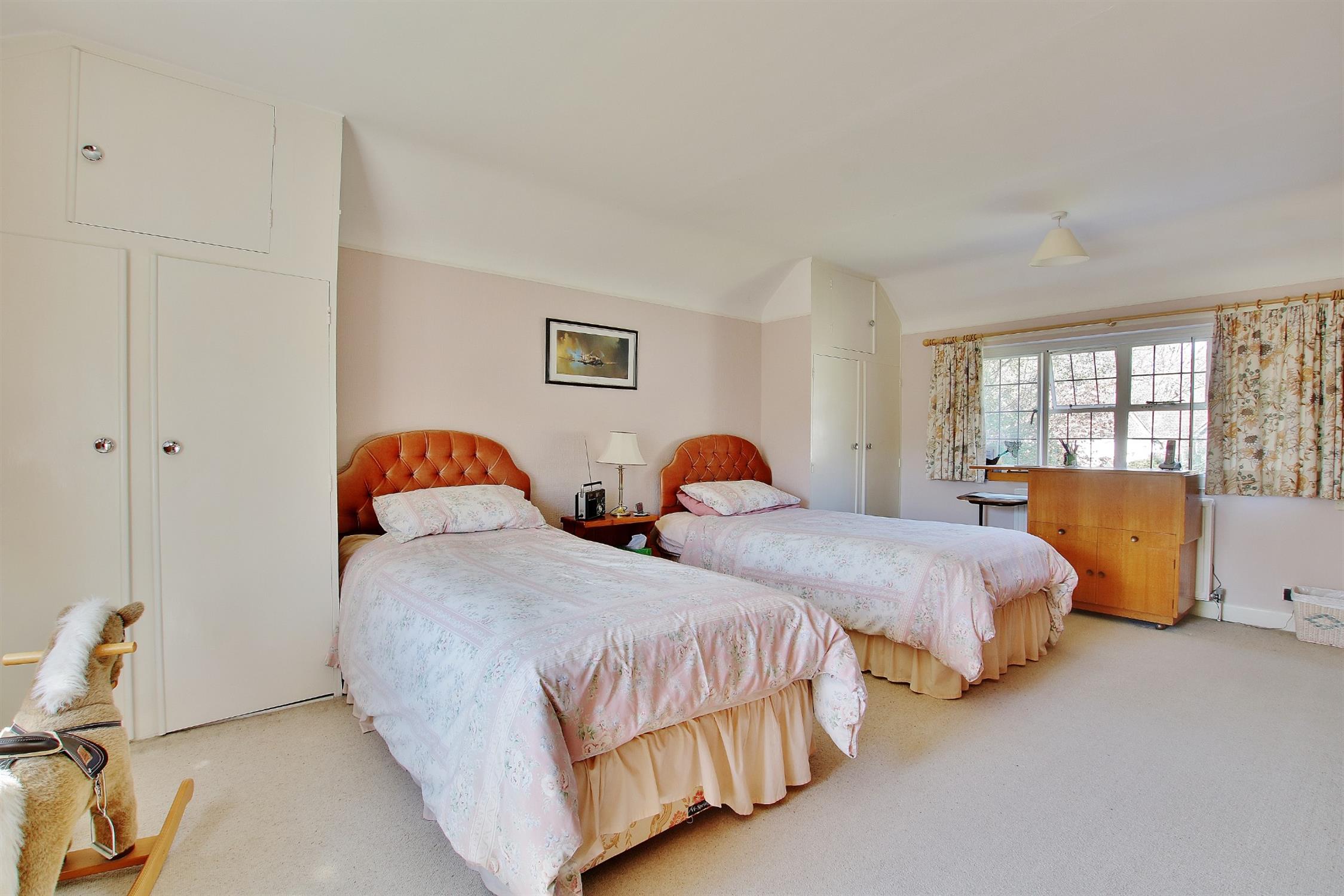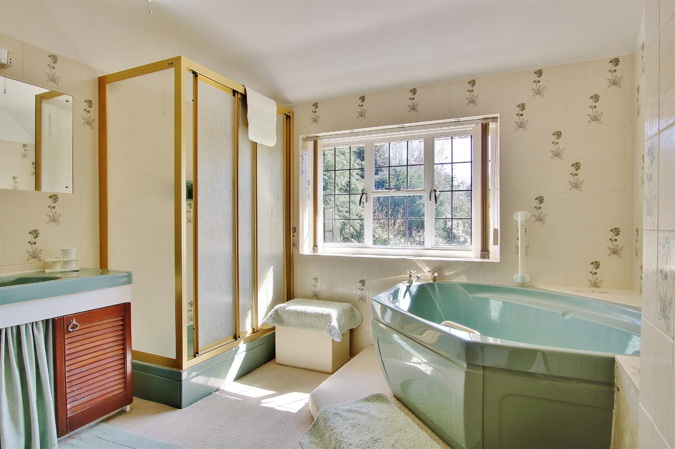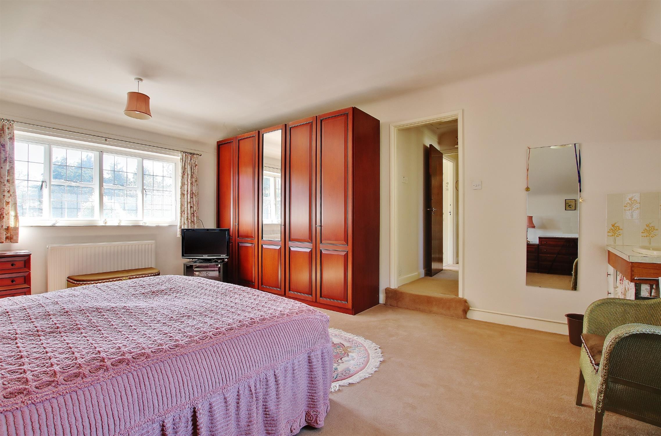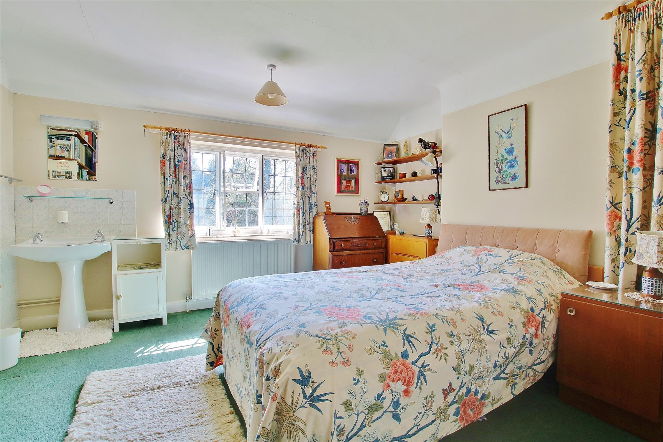 On the first floor is a galleried landing with window to the front aspect, walk-in cupboard, a separate airing cupboard housing the hot water tank, and access to the loft. The large master bedroom enjoys aspects to both the front and rear, as does the generous second bedroom which also has two fitted wardrobes. The third bedroom is a double size and all the bedrooms have wash basins. The family bathroom, originally the fourth bedroom, has a coloured suite comprising corner bath, separate tiled shower cubicle, a vanity unit with inset wash basin, and a separate matching WC. The original bathroom is now a cloakroom with WC and bidet, and could readily be made into an en-suite serving the master bedroom.