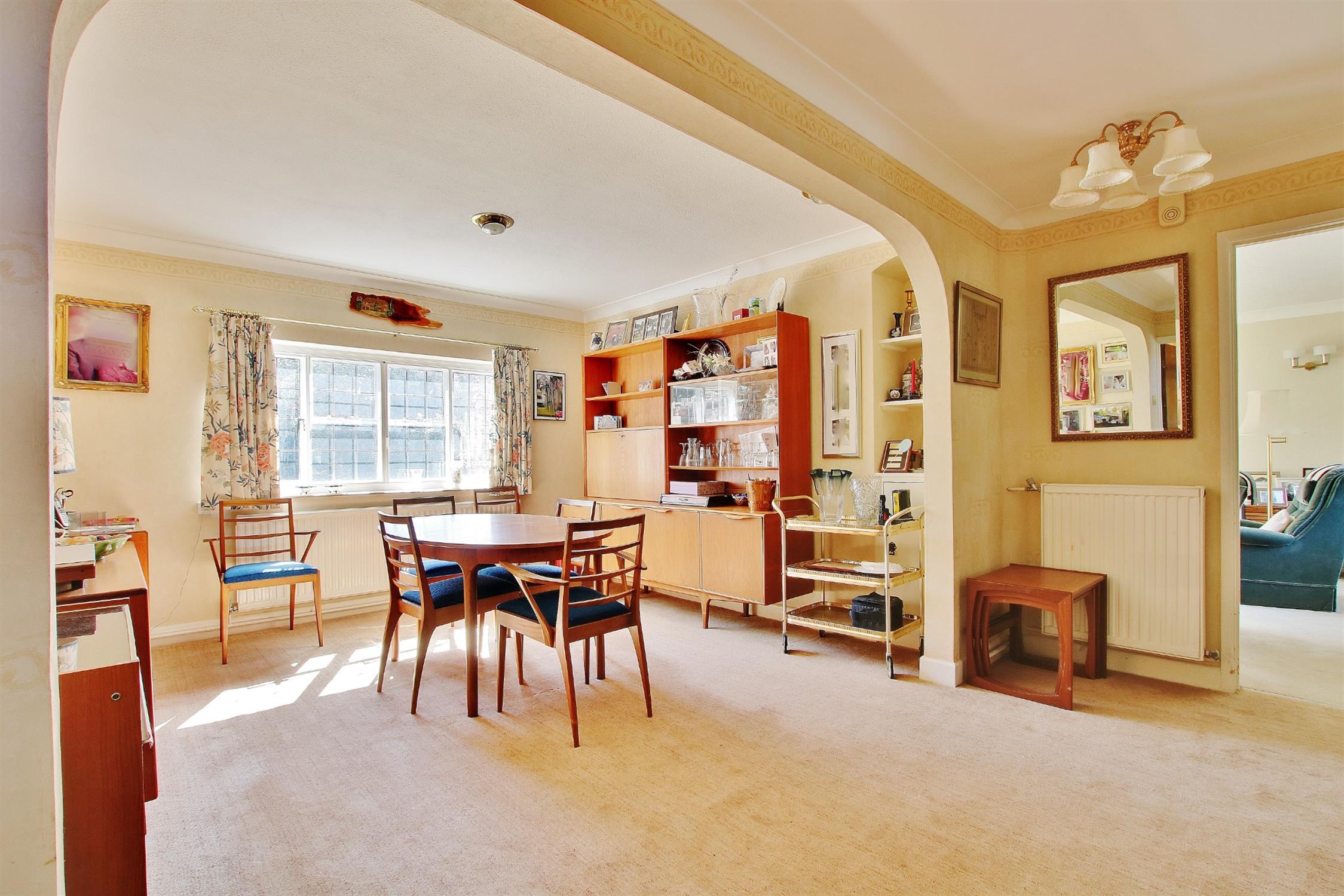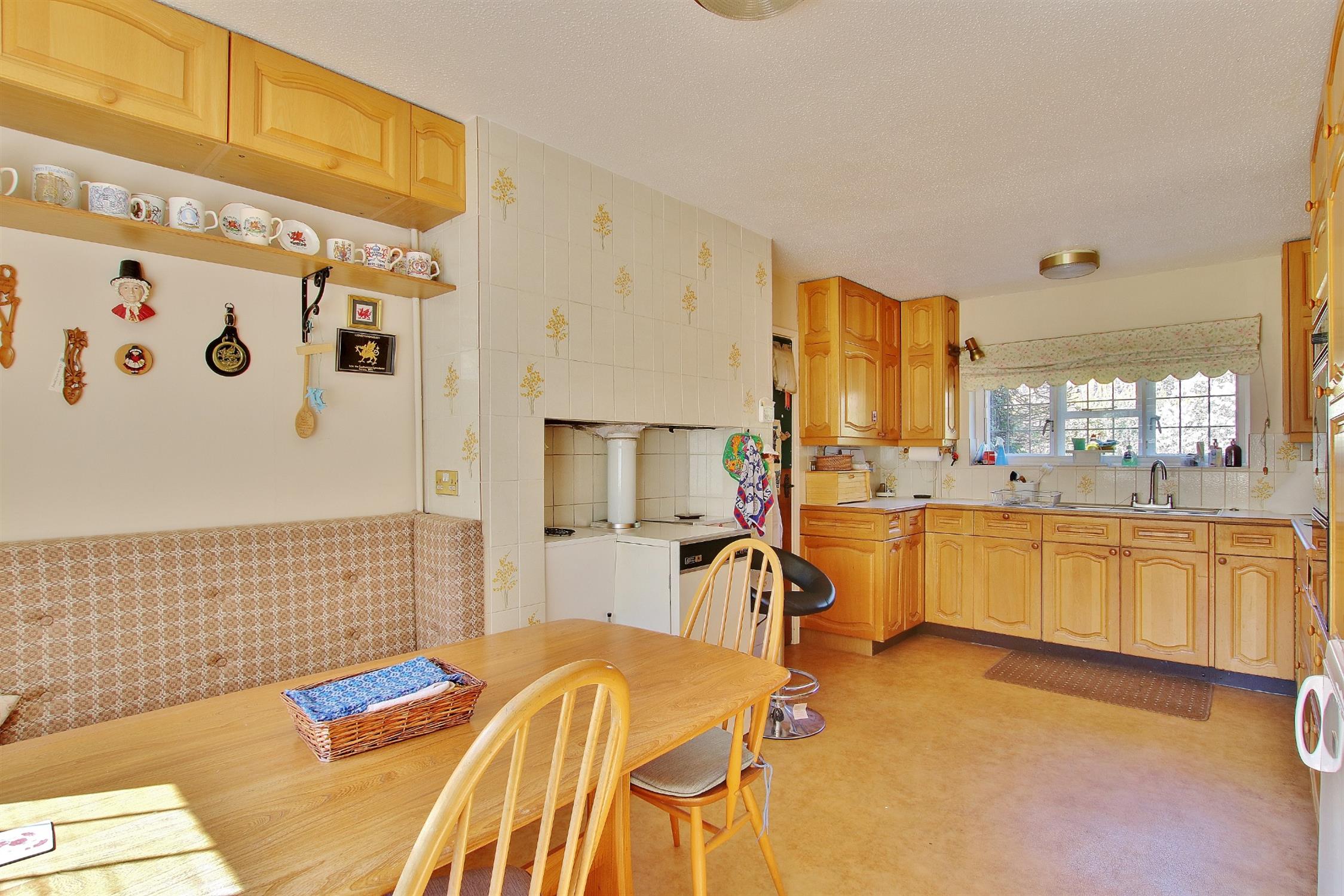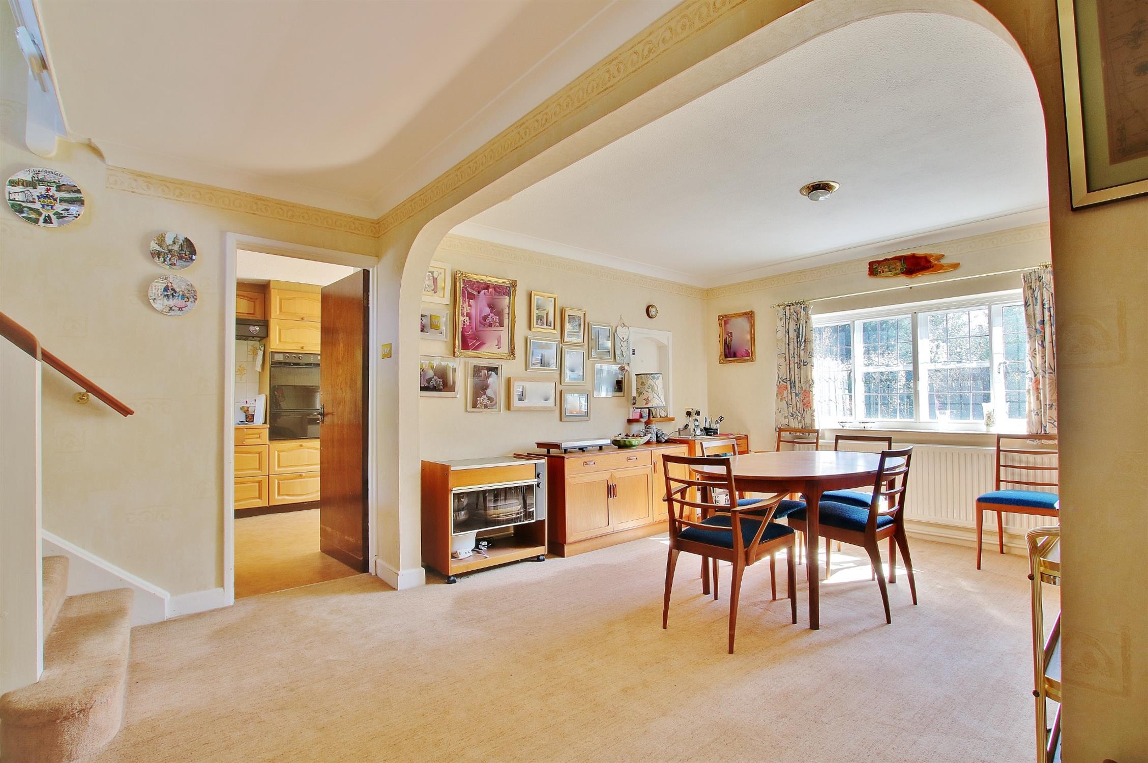 The property is entered via an enclosed porch which opens into a welcoming entrance hall with stairs to the first floor and an adjoining cloakroom with WC. A wide arch opens into the dining room which overlooks the rear garden and is the ideal space for entertaining and socialising with family and friends. Leading off the hall to the right is the spacious sitting room which has a feature fireplace and a pleasant double aspect with a window to the front and French doors opening onto the sun terrace and rear garden.
