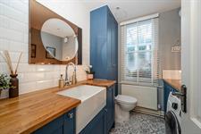 Smooth ceiling, inset spotlights, extractor fan, part obscured sash window, low level WC, wash hand basin set in work surface with cupboards beneath, a range of fitted cupboards with space and plumbing for washing machine, cupboard housing wall mounted gas Valiant combination boiler, part tiled walls, decorative laminate flooring.