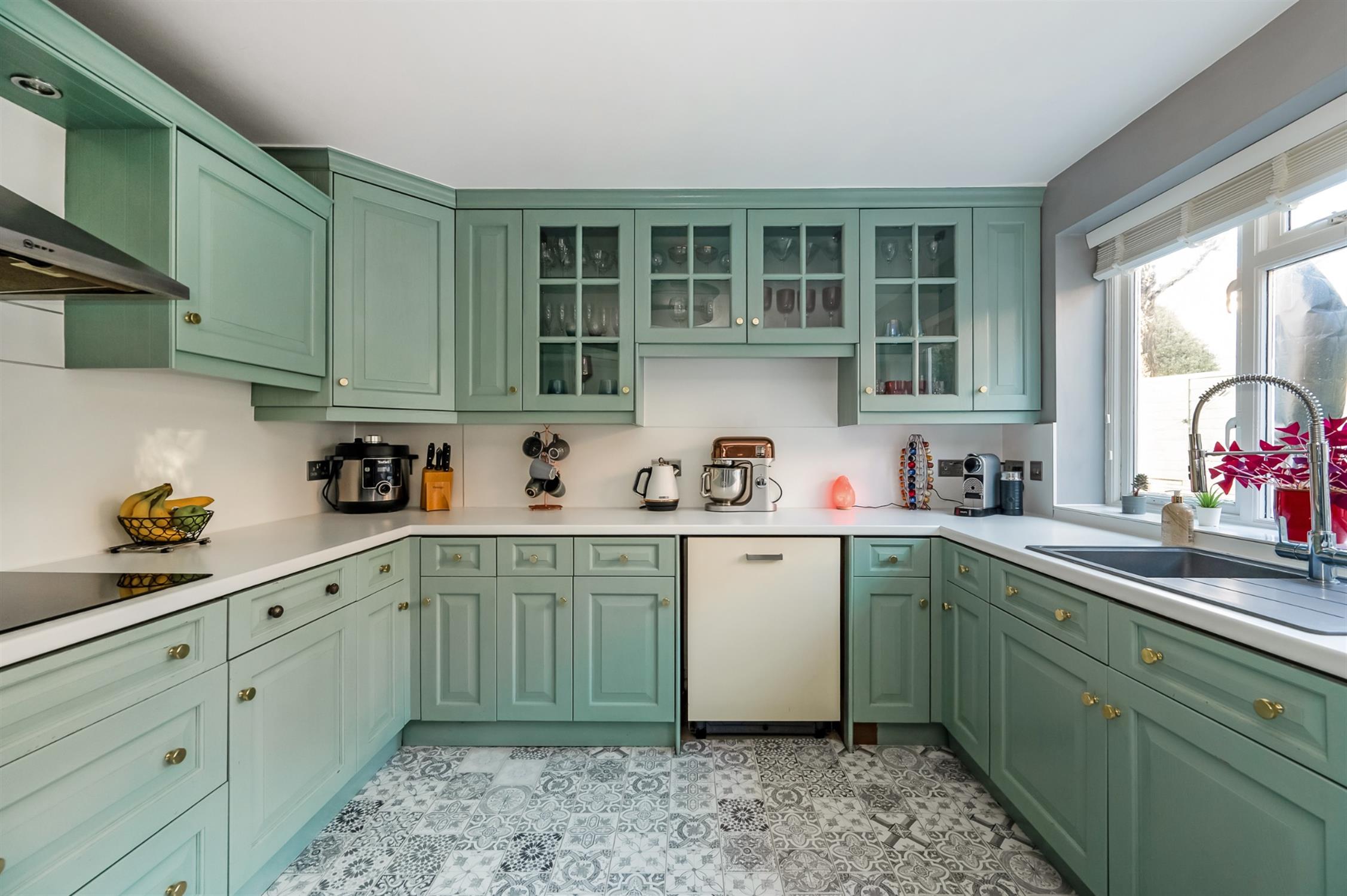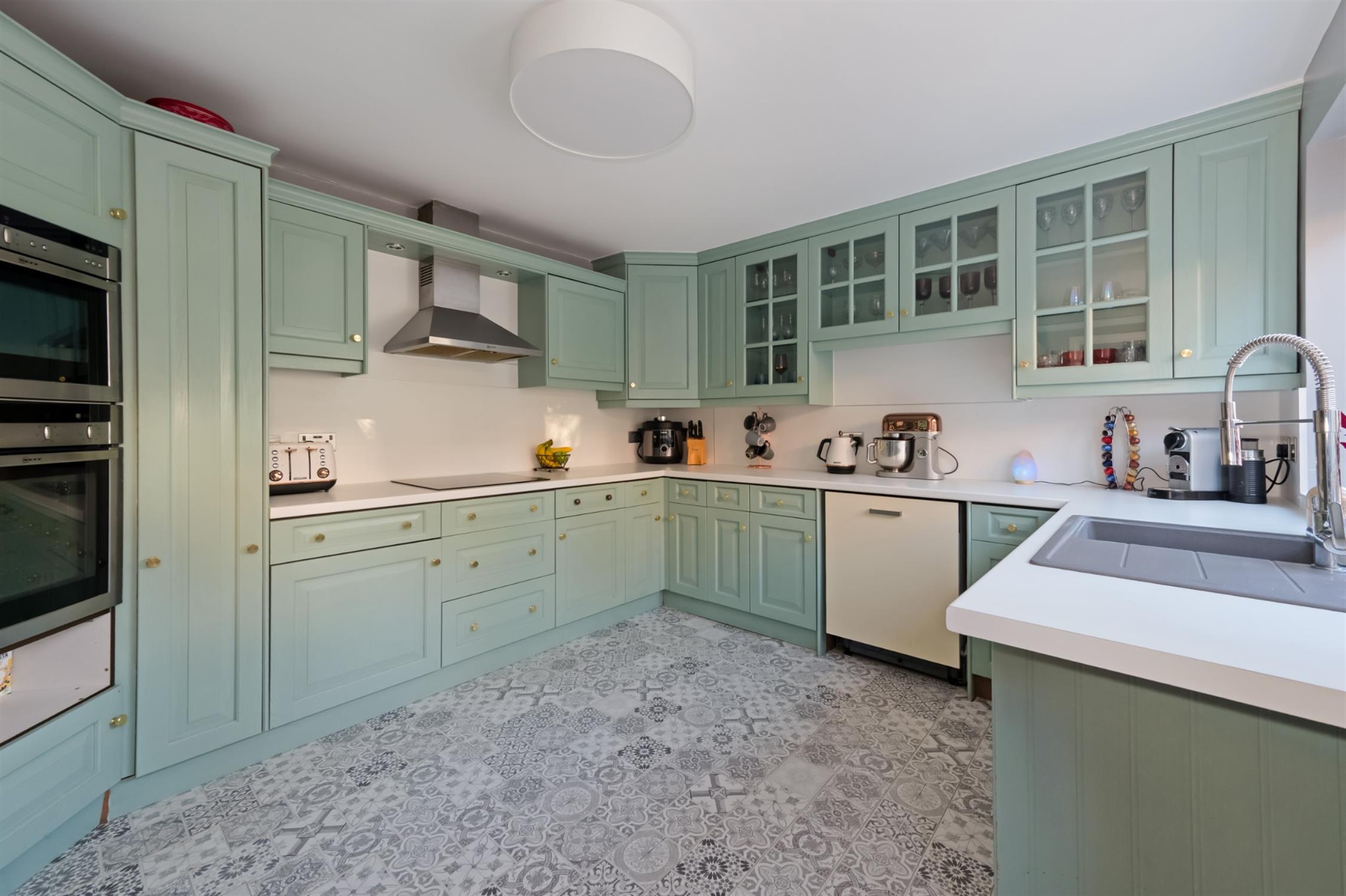 Smooth ceiling with inset spotlights, door to rear garden, double glazed window to side aspect, a range of wall and base mounted units with roll top work surfaces over with inset sink and drainer with mixer tap over, integrated double electric oven and microwave, integrated induction hob and extractor fan over, space for fridge freezer, space and plumbing for dishwasher, splashback, decorative laminate flooring.