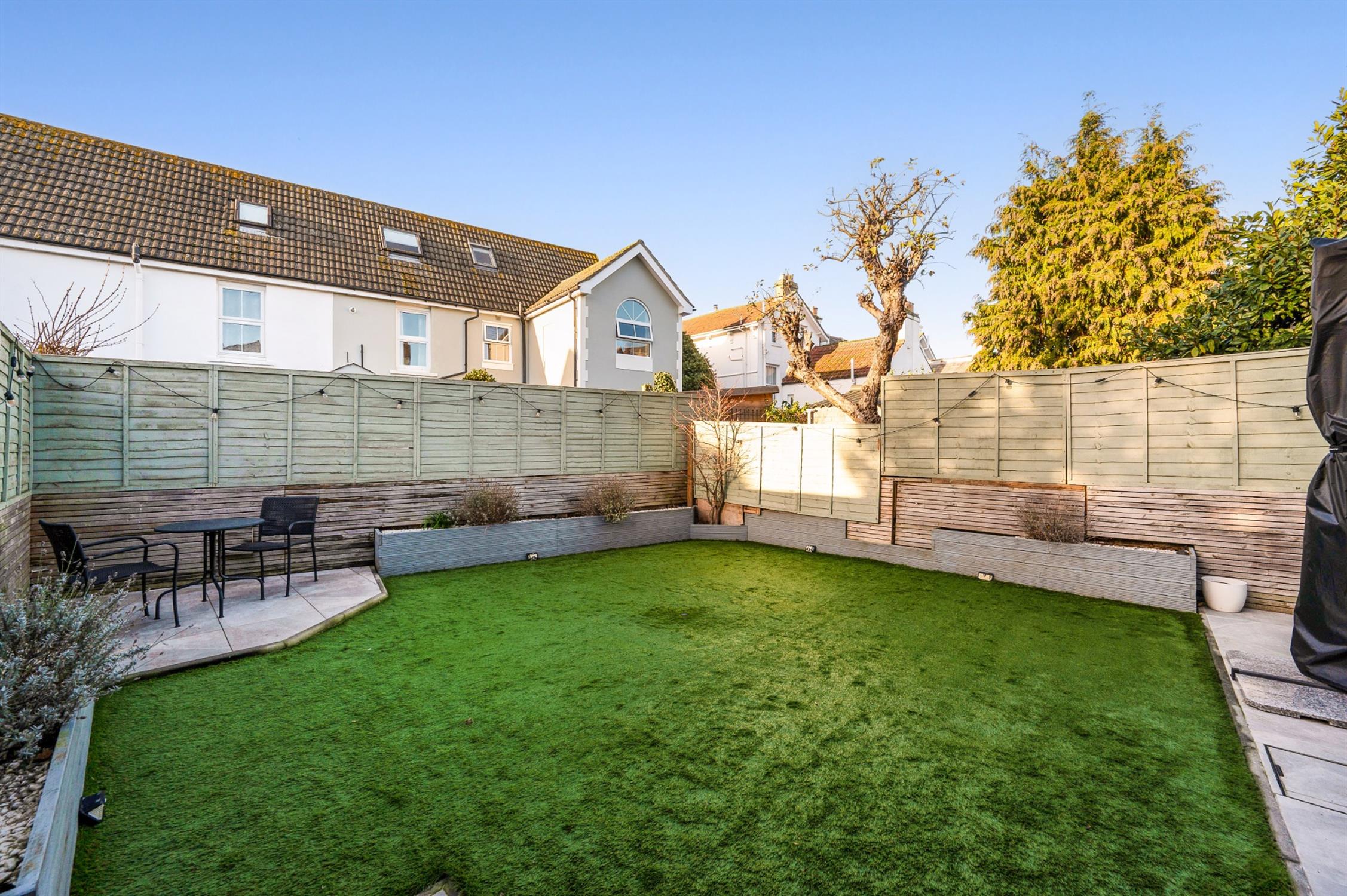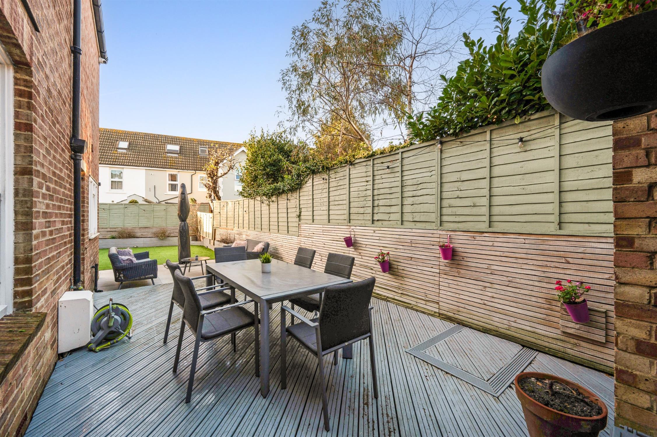 Part wall enclosed frontage with driveway providing off road parking, artificial lawn, planters, gated side pedestrian access. Wall and fence enclosed rear garden with a sizeable area of decking in the side return, an area of patio and a rear artifical lawned area with raised planters, rear patio, garden store.