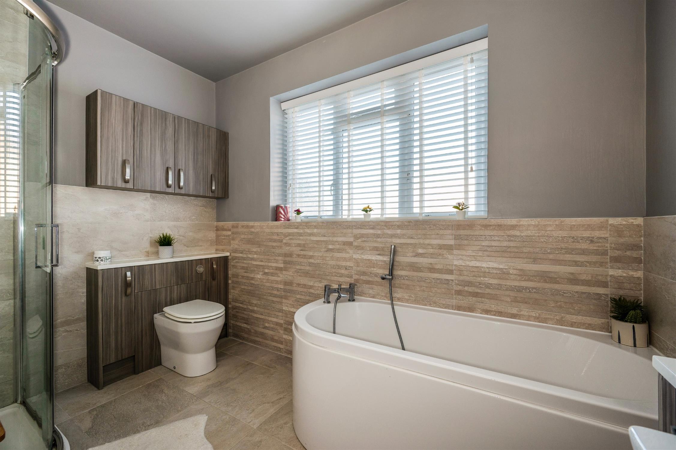Smooth ceiling, double glazed obscured side aspect window, extractor fan, large corner shower with rainfall attachment, panel bath with mixer tap and shower attachment, low level WC set in vanity unit with cupboards above, wash hand basin with fitted cupboards beneath, ladder radiator, part tiled walls, tiled floor.
