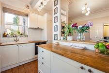 The kitchen features wooden worktops and offers plenty of work surface space, along with an electric hob and oven and an integrated fridge freezer.
